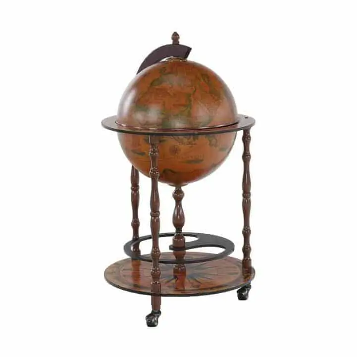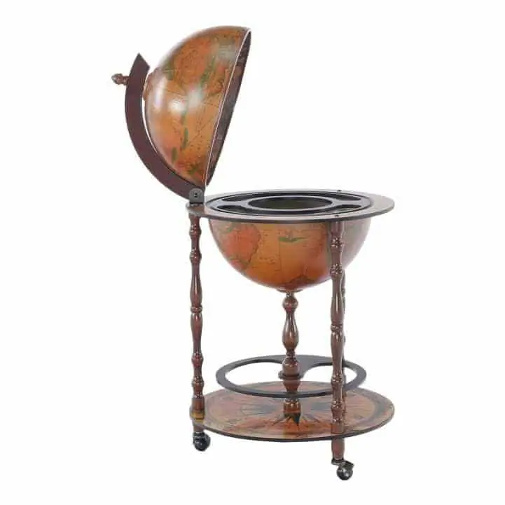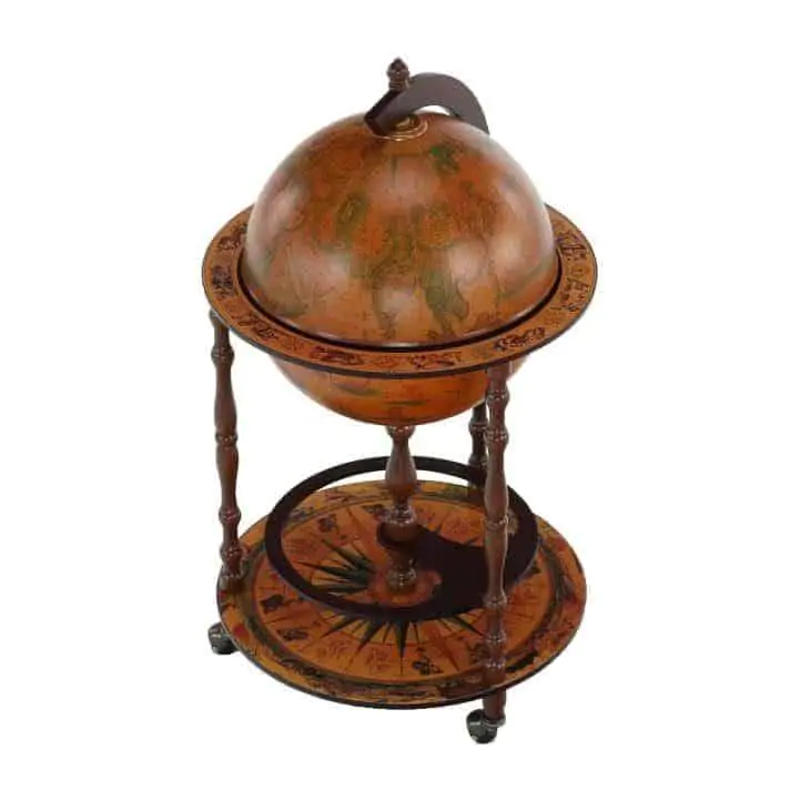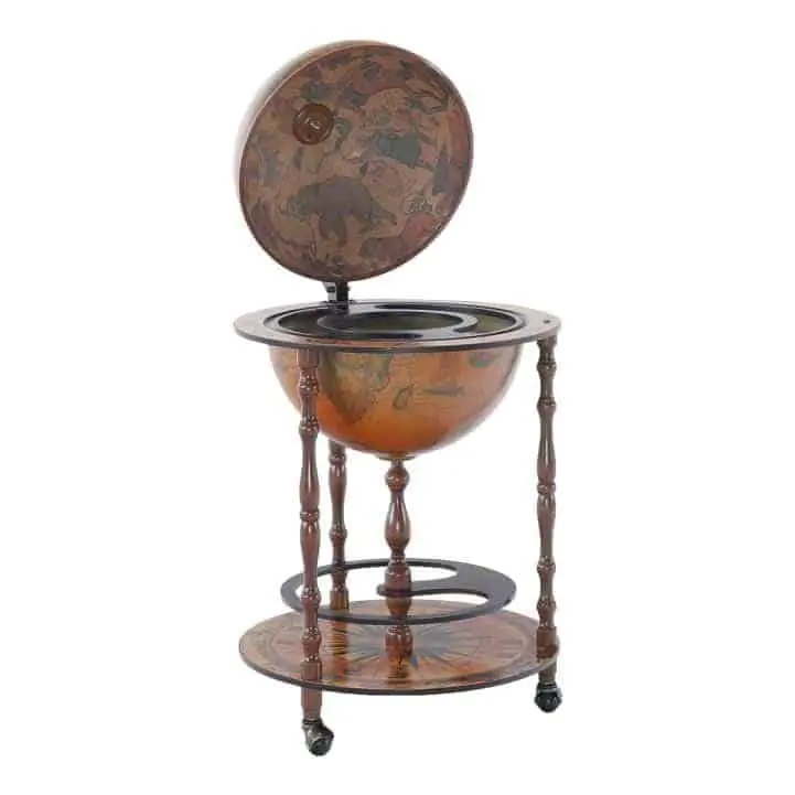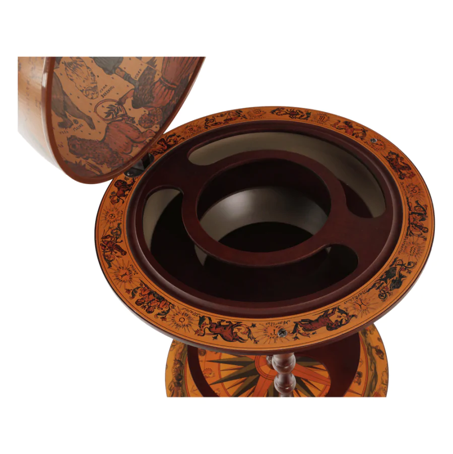 Provedení: Elegantní a originální servírovací barový stolek ve tvaru globusu s odklápěcím víkem. Vrchní část je otočná. Tento servírovací stolek v retro stylu je vybaven třemi nohami s kolečky, které umožňují snadnou manipulaci se stolkem. Vespod je stolek doplněn praktickou odkládací poličkou. Barový stolek Globus v dekoru třešeň je vyroben v kombinaci dřeva, MDF a plastu. Průměr glóbu je 50 cm, výška stolku je 94 cm. Stolek je dodáván v demontu.