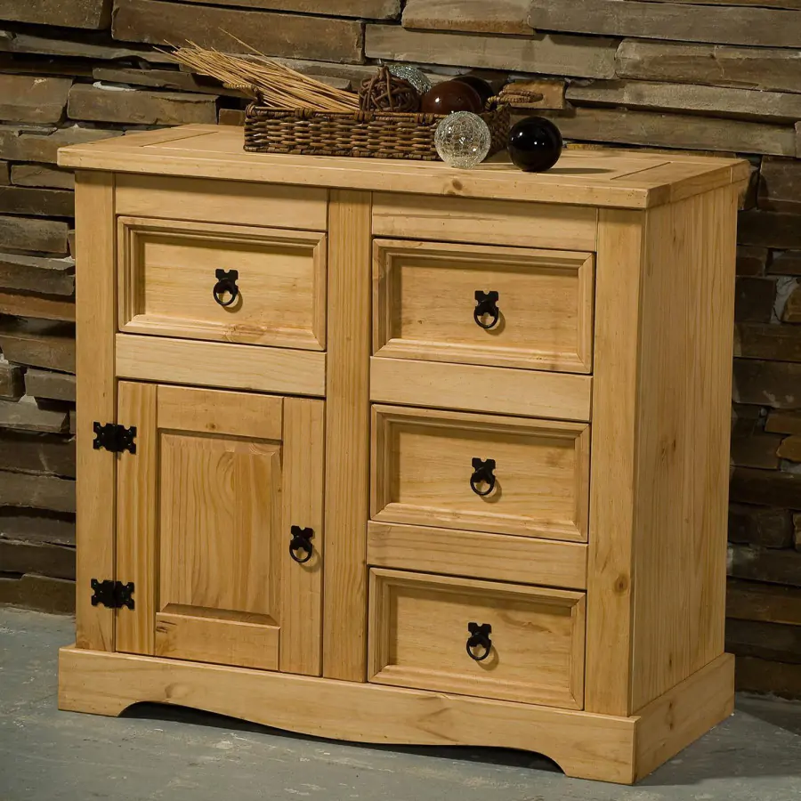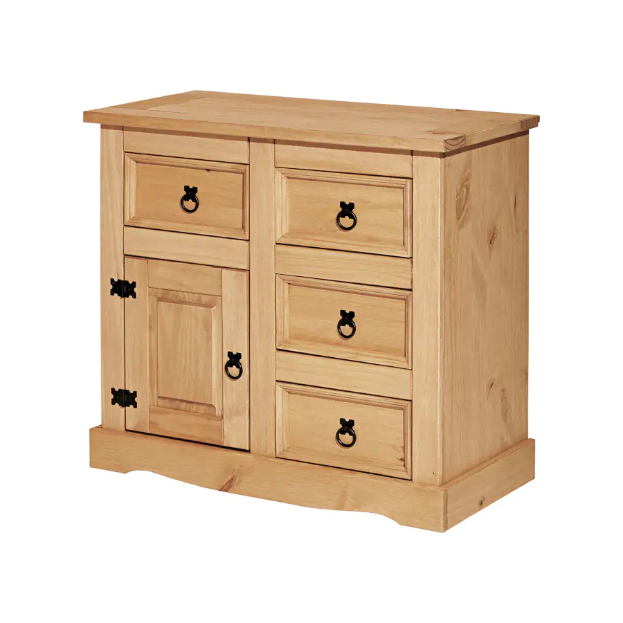 Komoda je vyrobená z borovicového masivu, který je povrchově zakončen voskem v medovém odstínu. Dekorační transparentní vosky odpuzují vodu a nečistoty. Tato komoda má jedny dvířka a čtyři menší zásuvky s kovovými úchytky. Komoda patří mezi velmi praktické úložné prostory v domácnosti. Zboží je dodáno v demontu.