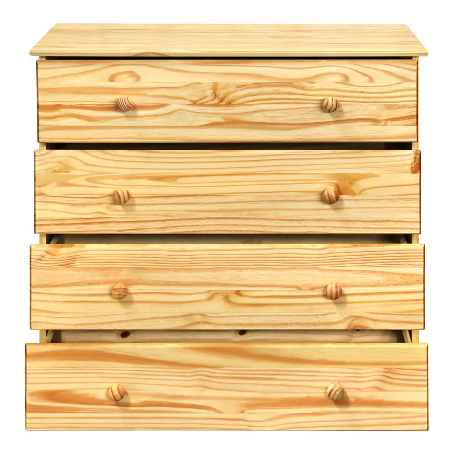 Zásuvková komoda z masivního smrku v lakovaném provedení. Obsahuje 4 široké zásuvky s kovovými pojezdy, hloubka zásuvky 36,5 cm. Dodáváno v demontu.