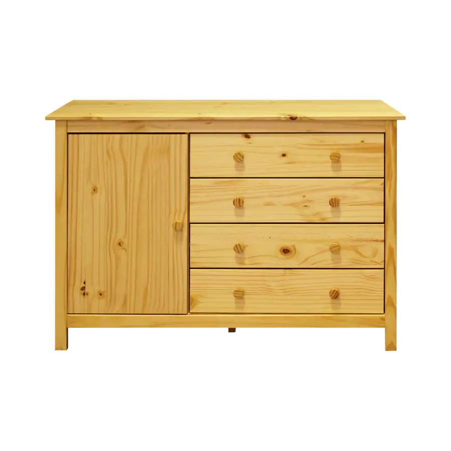 Provedení:Dřevěný prádelník je vyrobený z borovicového masivu. Prádelník patří mezi velmi praktické úložné prostory v domácnosti. Tento prádelník má čtyři zásuvky s kovovými pojezdy. V levé části jsou dvířka, za kterými se nachází police. Povrchová úprava:Prádelník je povrchově zakončen dekoračním voskem, který nechá vyniknout přirozenou kresbu dřeva. Dekorační transparentní vosky odpuzují vodu a nečistoty.