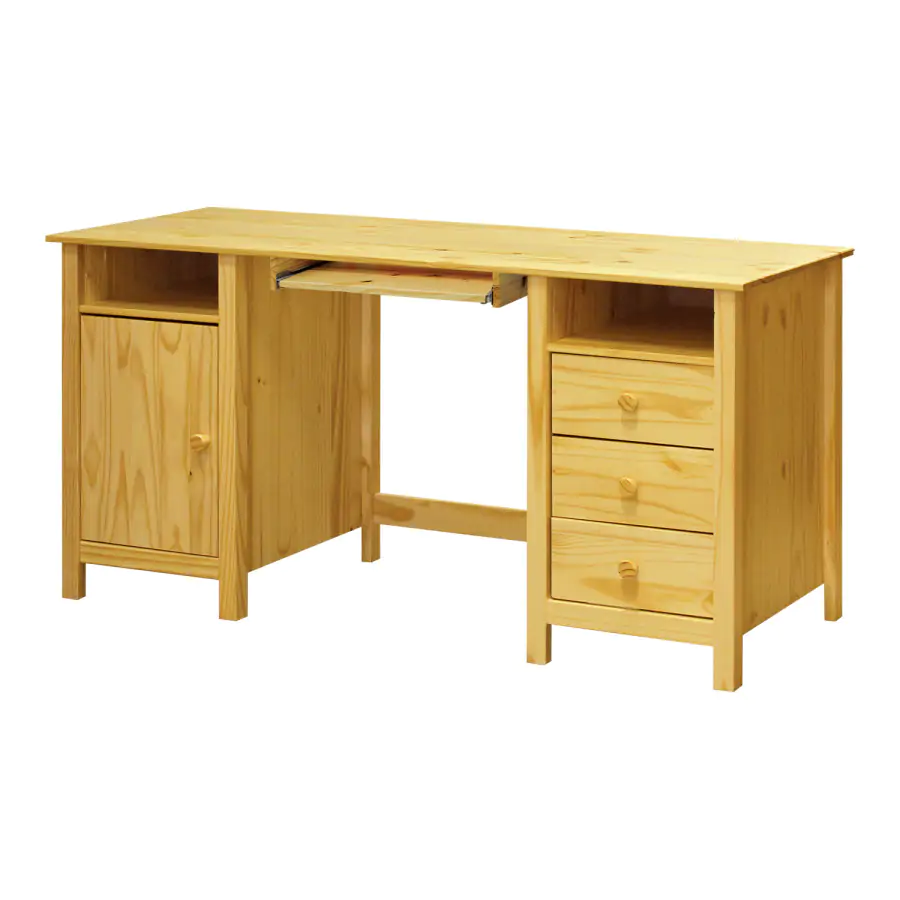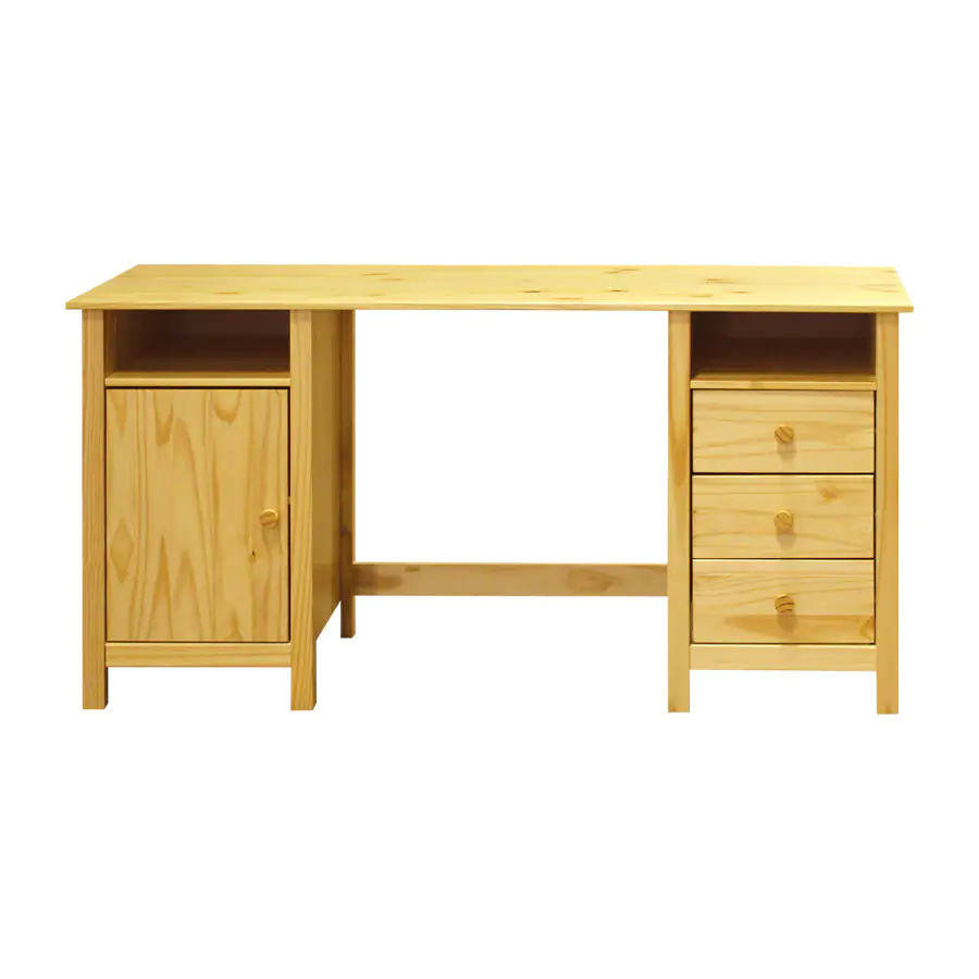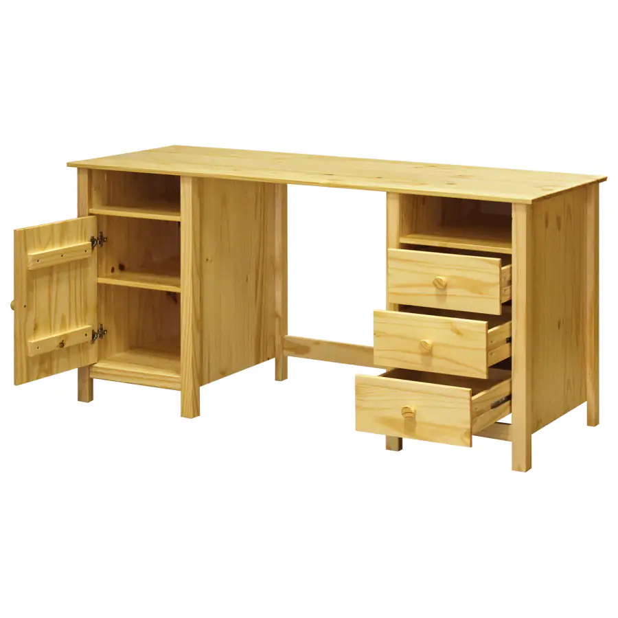 Provedení:Psací stůl je vyrobený z borovicového masivu. Tento stůl má na pravé straně tři praktické zásuvky s kovovými pojezdy, nad nimiž nalezneme otevřenou polici. Na levé straně se nachází další otevřená police a úložný prostor za otočnými dvířky. Tento využije každý student. Rozměr mezi skříňkou a zásuvkami je 63 cm. Zboží je dodáváno v demotnu. Povrchová úprava:Stolek je povrchově zakončen dekoračním voskem, který nechá vyniknout přirozenou kresbu dřeva. Dekorační transparentní vosky odpuzují vodu a nečistoty.