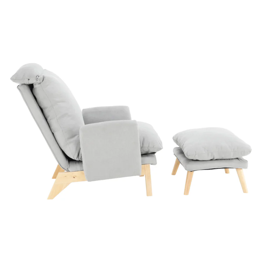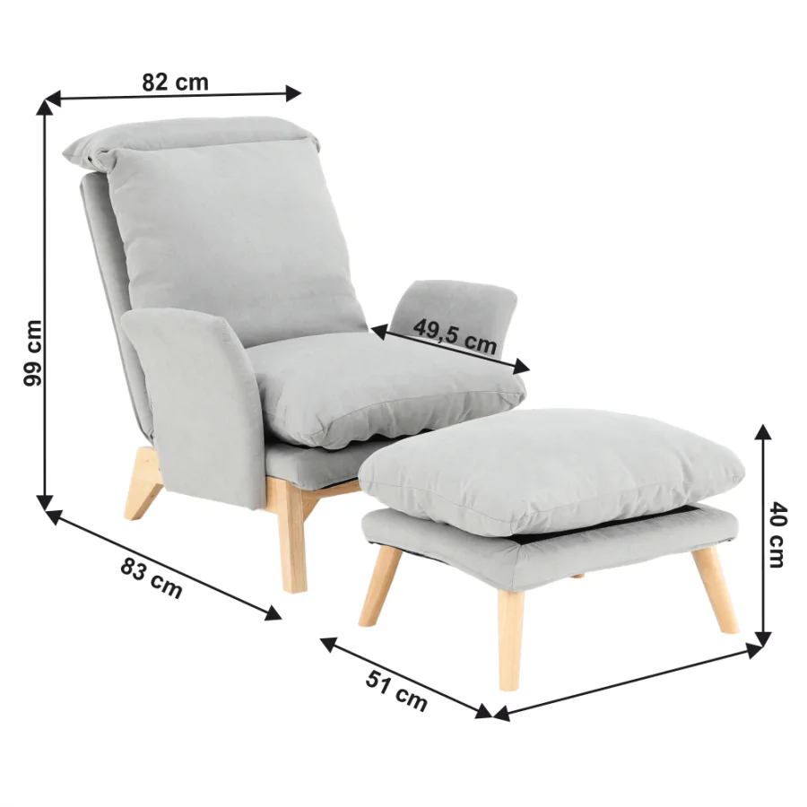 Křeslo ZANDER s podnoží ve skandinávském stylu. Je čalouněno kvalitní látkou ve světle šedé barvě, nohy jsou z masivního dřeva v přírodní barvě. Křeslo lze polohovat, jemným zatlačením zádovou opěrku sklopíte do relaxační polohy. Hloubka sedu: 49,5 cm Rozměry taburetu (ŠxHxV): 63x51x40 cm Nosnost taburetu: 90 kg Dodávané v demontu.