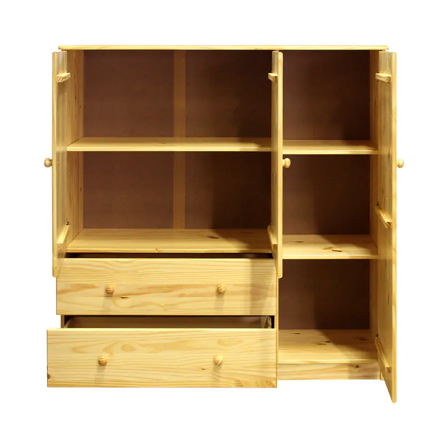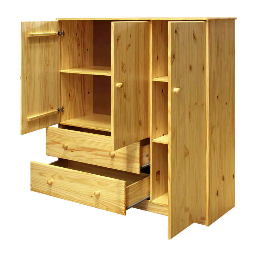 Prádelník 3 dveře + 2 zásuvky v provedení masiv borovice, lakovaný, nechá vyniknout přirozenému dezénu dřeva a vytvoří ve vašem pokoji naprostou harmonii. Velký prádelník se bude nejlépe vyjímat ve vaší ložnici či prostorné šatně, své uplatnění však najde i v obývacím pokoji. Prostorný prádelník je šikovně dělen v poměru 2:1. V pravé části prádelníku naleznete větší úzký prostor s dvířky, za kterými se nacházejí dvě police, v levé části pak menší prostor obsahující dvoje dvířka, za kterými naleznete jednu polici. V levé části pod prostorem s dvířky dále využijete široké zásuvky s kovovými pojezdy na drobné prádlo. Do masivního prádelníku tak uložíte ložní prádlo, oblečení i nejrůznější dokumenty.