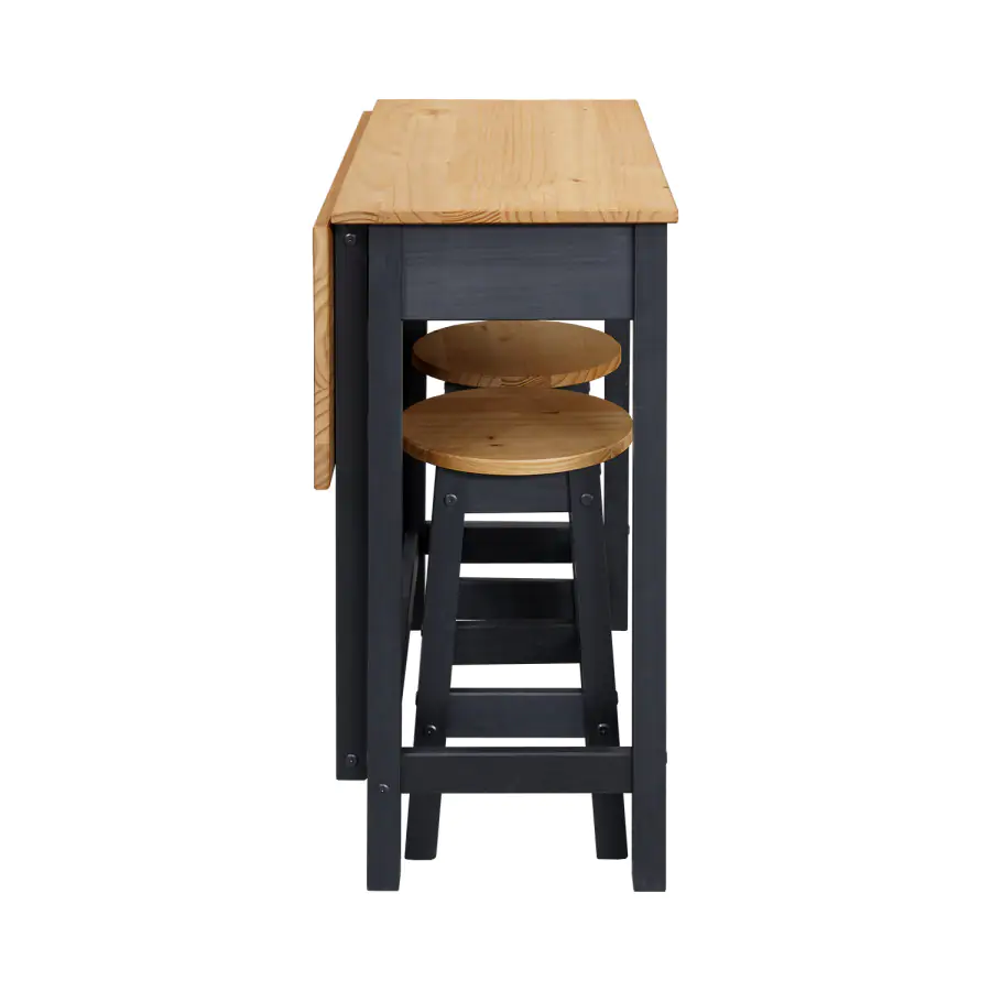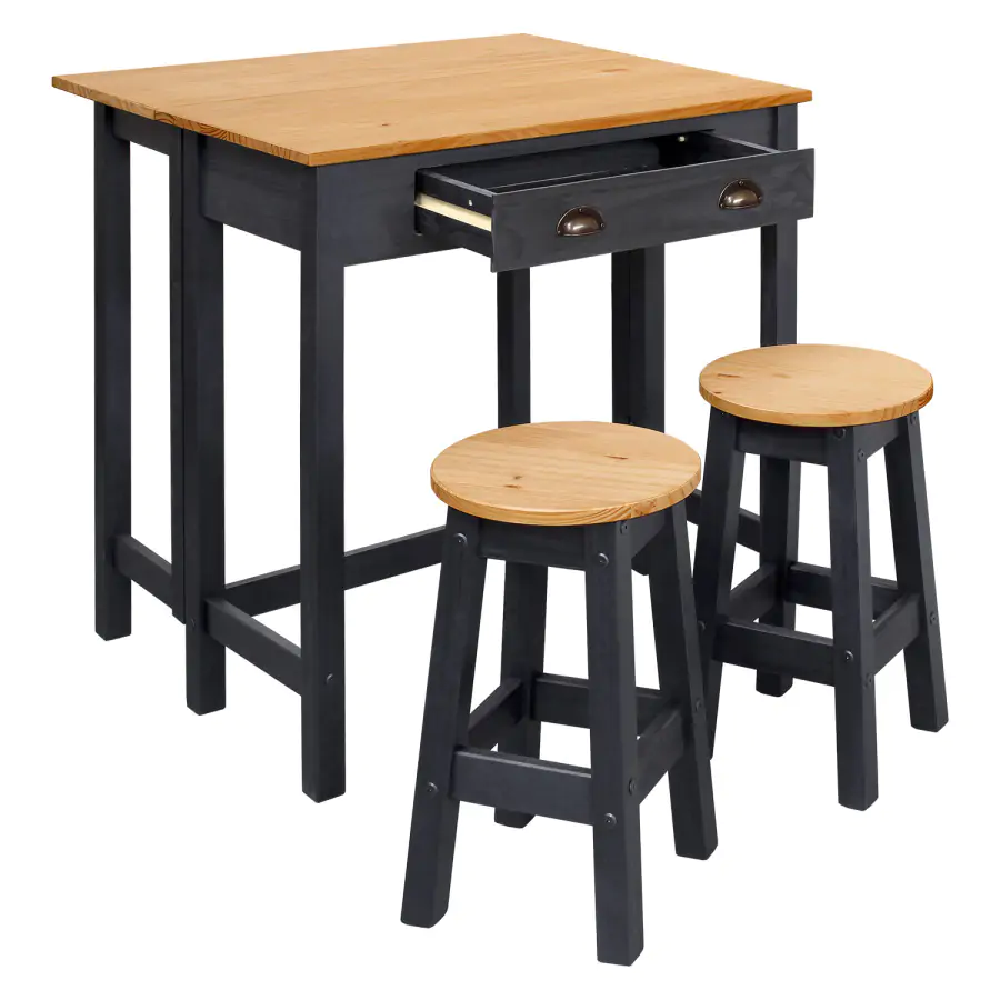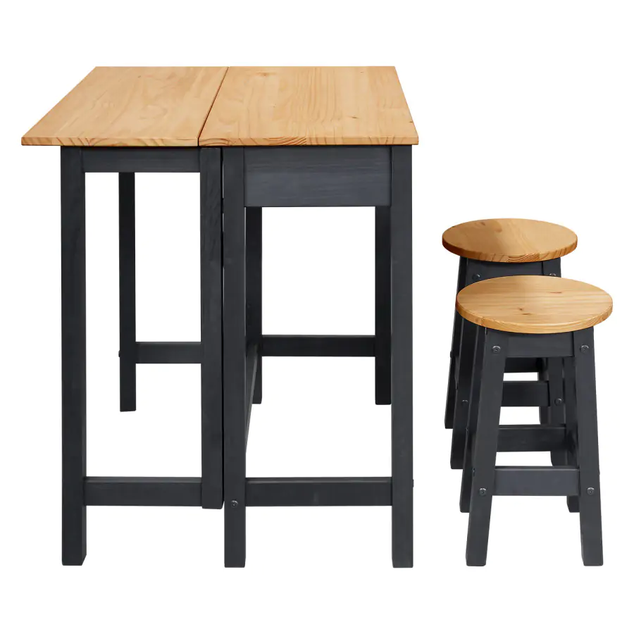 Praktická sestava TAPAS. materiál masiv borovice voskovaná v medovém odstínu a černém odstínu skládací stůl se zásuvkou dvě barové židličky Rozměr složeného stolu (š/h/v) 80 × 42 × 84 cm - rozloženého stolu (š/h/v) 80 × 72 × 84 cm. Rozměr židličky (š/h/v) 30 × 30 × 51 cm. Dodáváno v demontu.