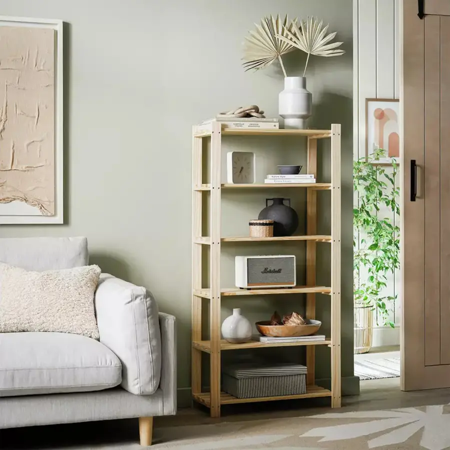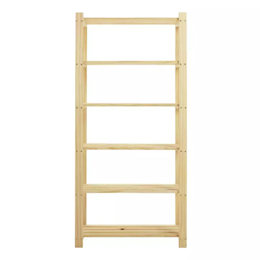 Praktický a všestranný regál. materiál masiv borovice nelakované provedení šest polic dodáváno v demontu Policový regál, který je vždy potřebný. Najde uplatnění v každém pokoji.