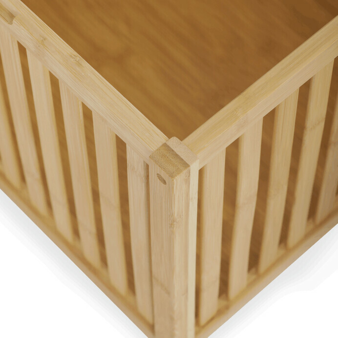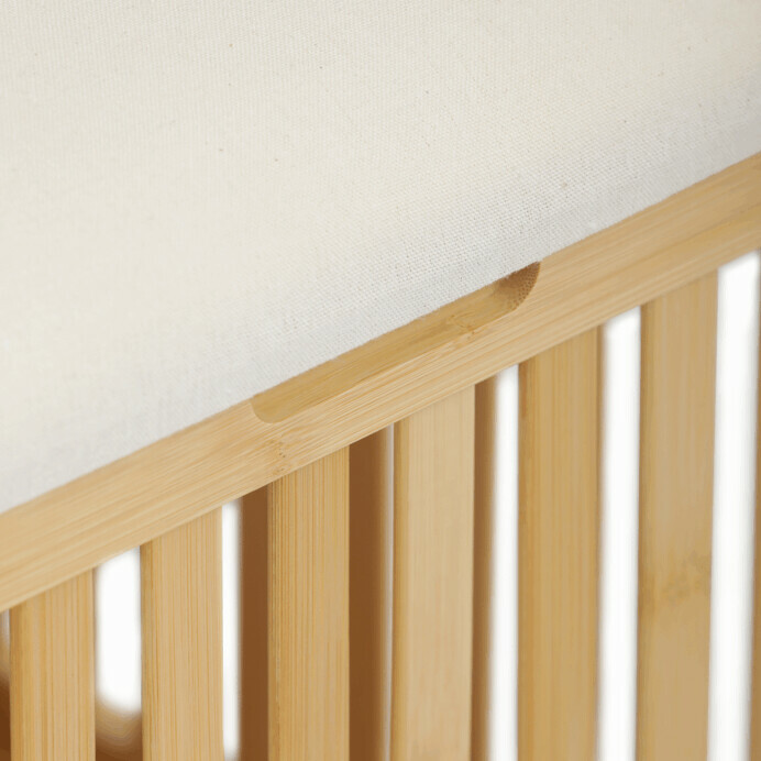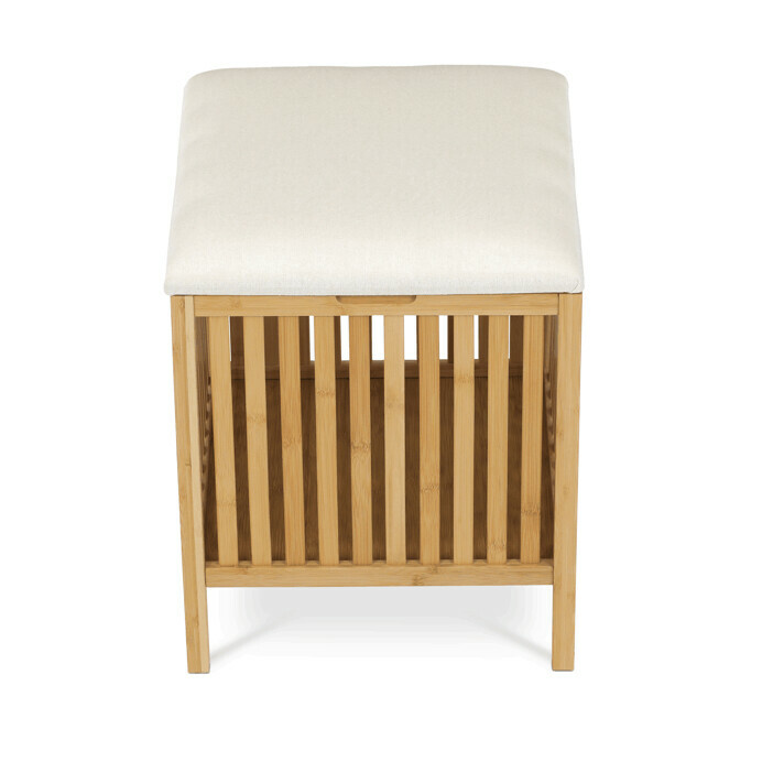 Taburet z masivního bambusu v přírodním odstínu kombinuje praktický úložný prostor s možností sezení díky polstrovanému sedáku v jemné bílé barvě. Bambusové lamely tvoří pevnou a vzdušnou základnu, která umožňuje cirkulaci vzduchu uvnitř koše. Polstrovaný sedák je potažený látkou, která se snadno udržuje a zvyšuje komfort při sezení. Díky svému přírodnímu vzhledu se hodí do různých interiérů, kde přináší přírodní atmosféru a funkčnost v jednom.