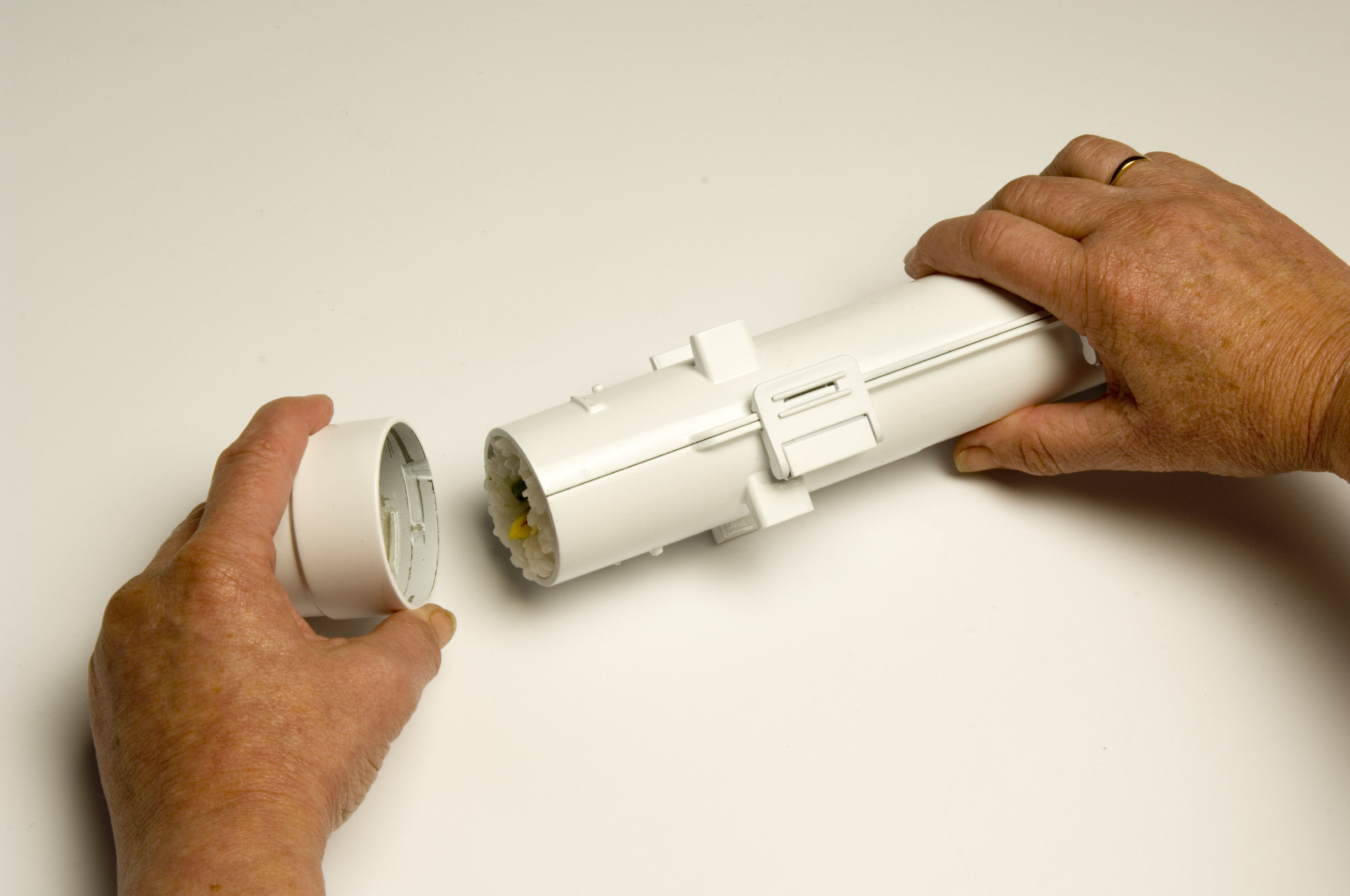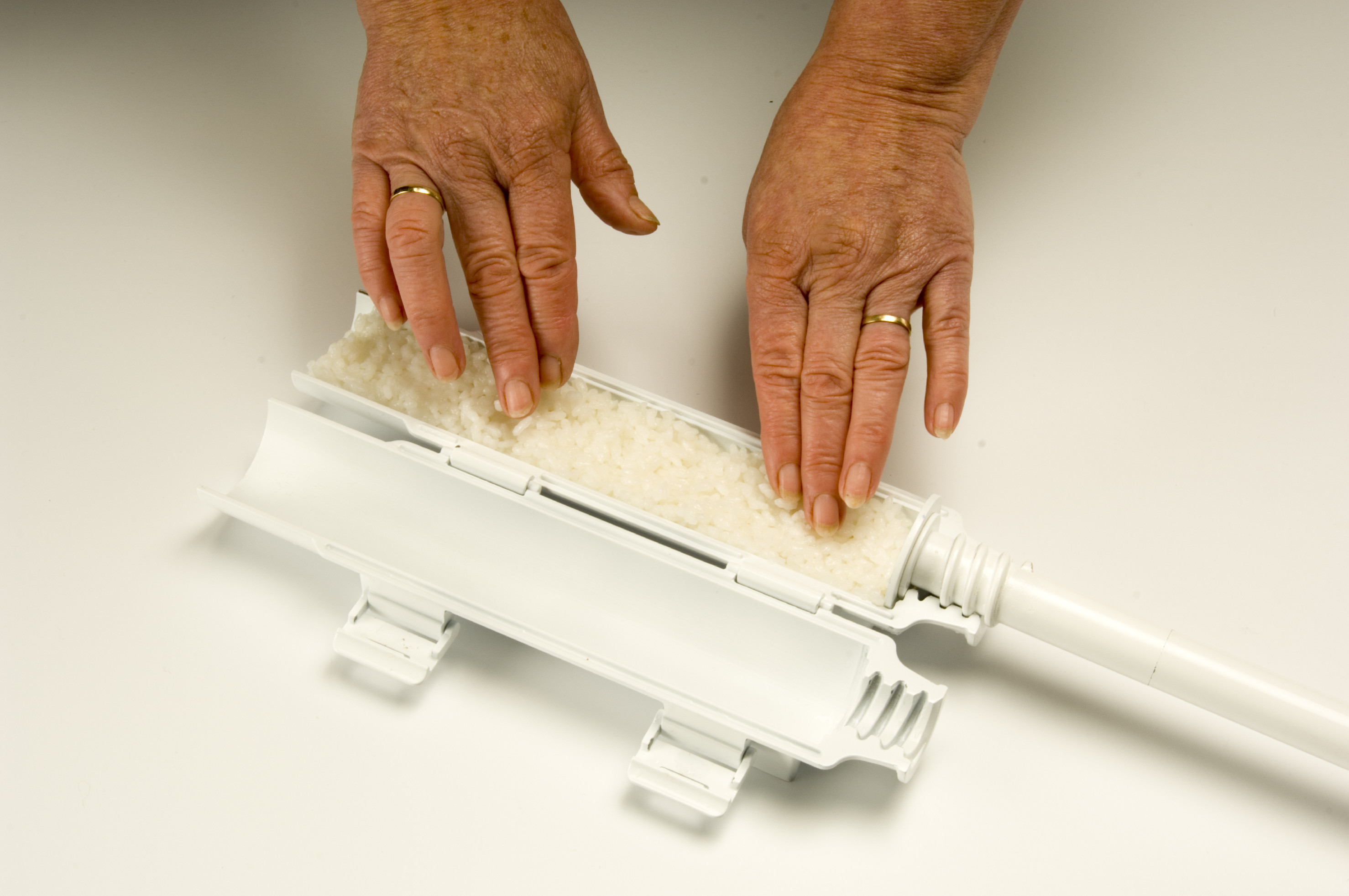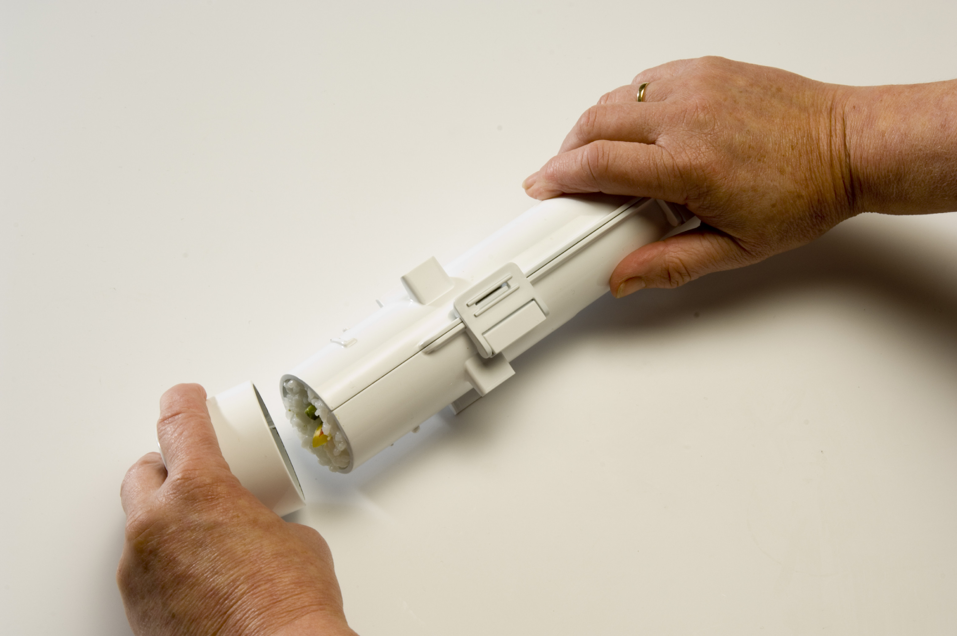 - Vytáhněte píst a přiložte ho na střed první poloviny SUSHEZI. Tlakem na píst vytvořte drážku. Přesvědčte se, že konec pístu je na poslední pozici za závitem. To samé proveďte na druhé polovině SUSHEZI. Tím vytvoříte rovnou a úhlednou drážku pro náplň.