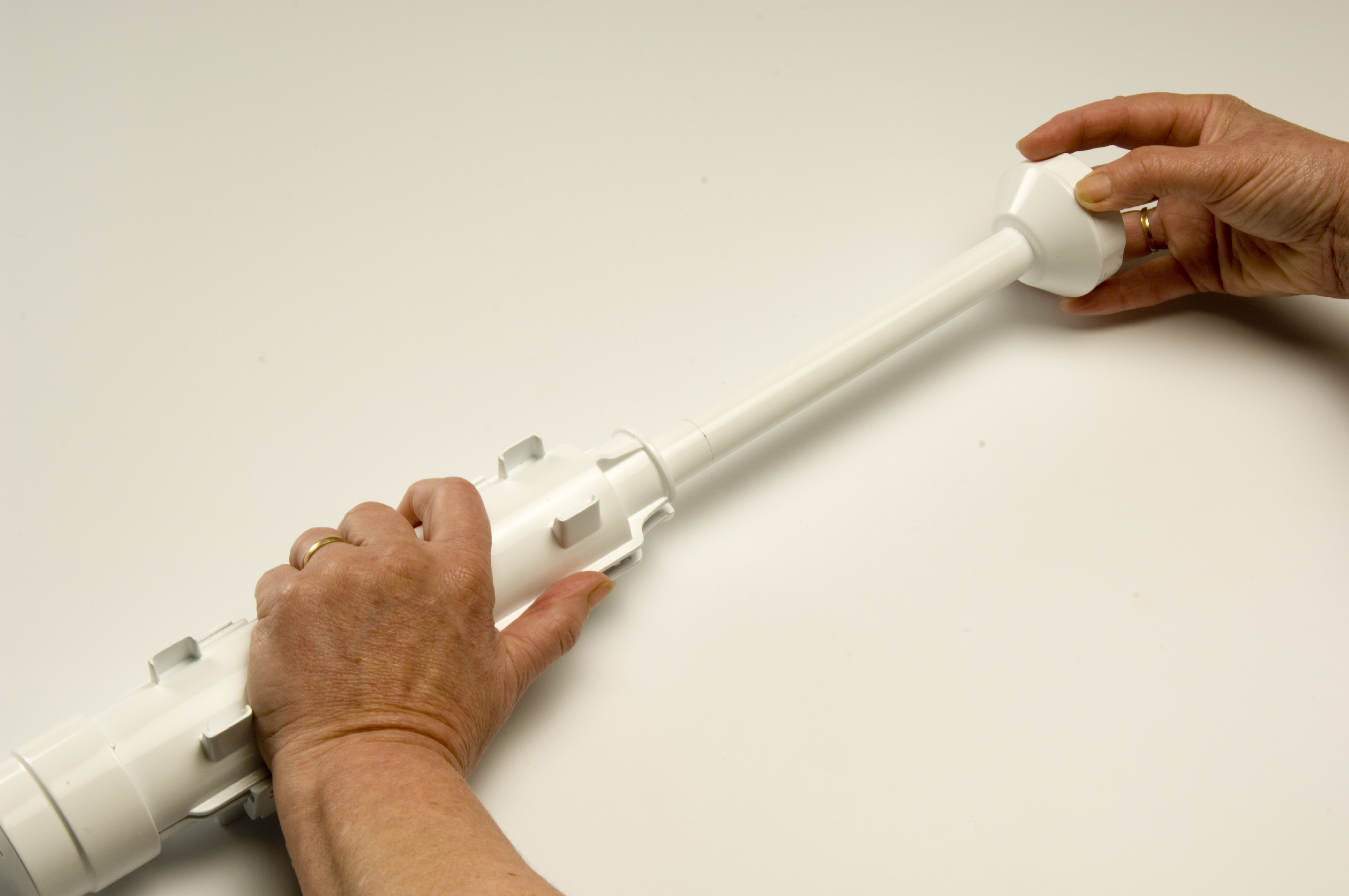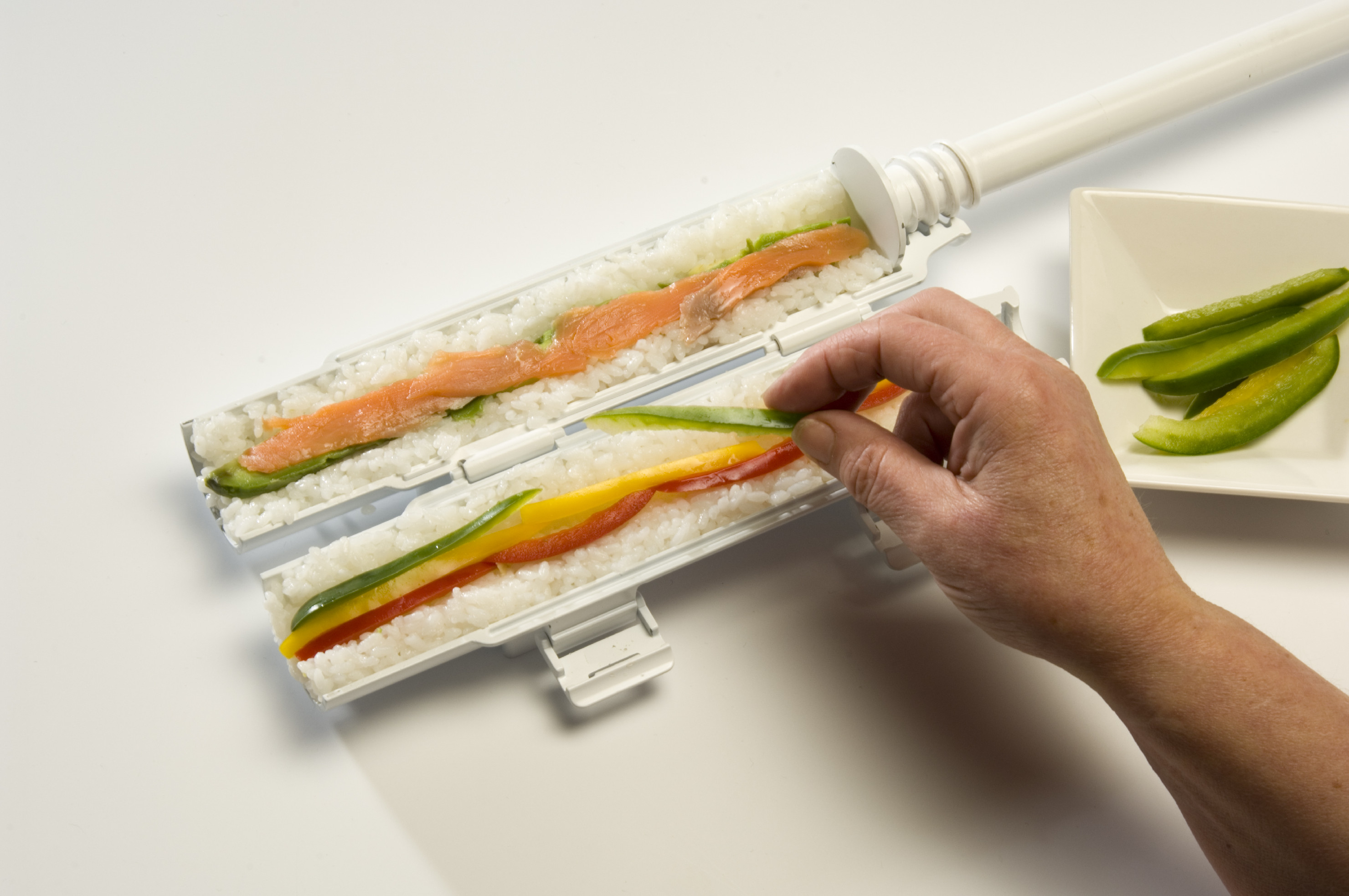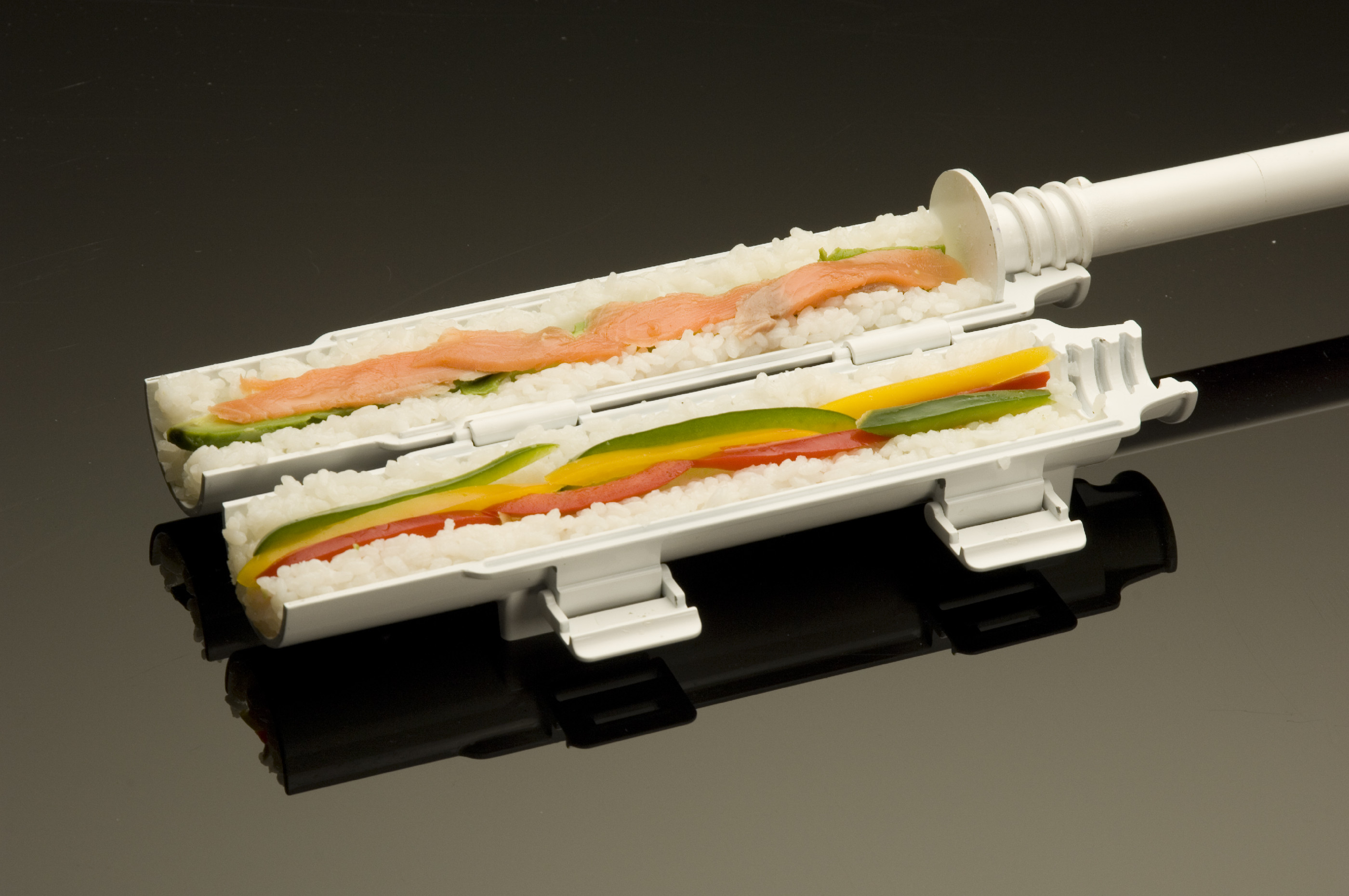 - Vytáhněte píst a přiložte ho na střed první poloviny SUSHEZI. Tlakem na píst vytvořte drážku. Přesvědčte se, že konec pístu je na poslední pozici za závitem. To samé proveďte na druhé polovině SUSHEZI. Tím vytvoříte rovnou a úhlednou drážku pro náplň.