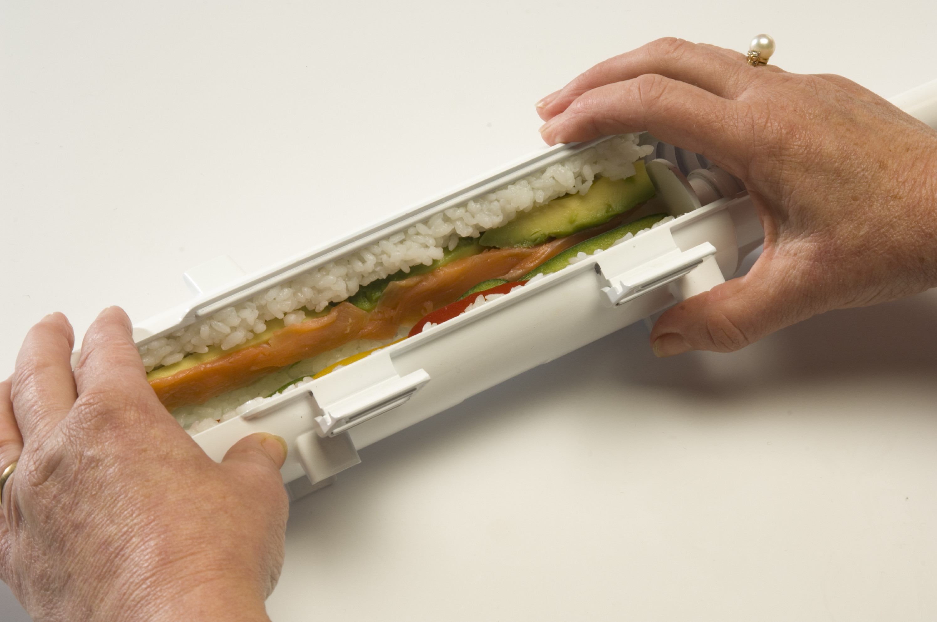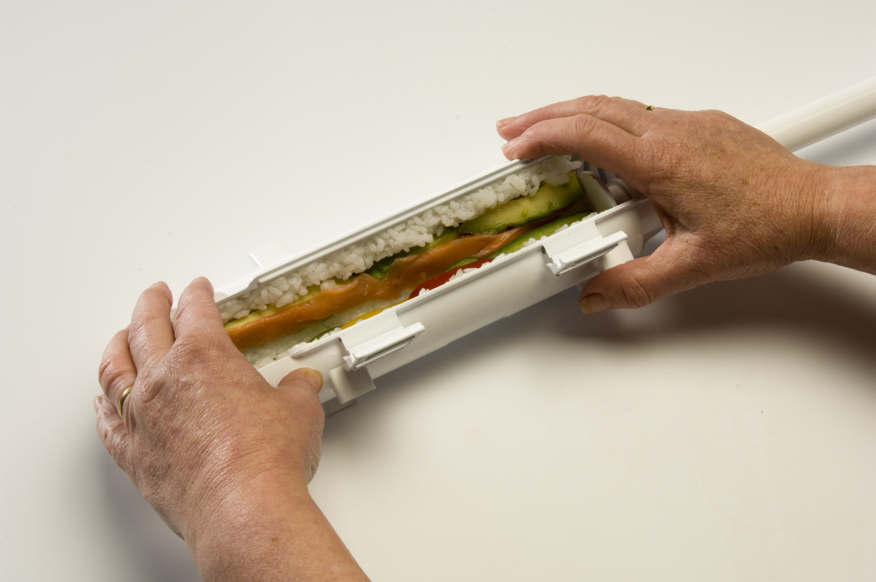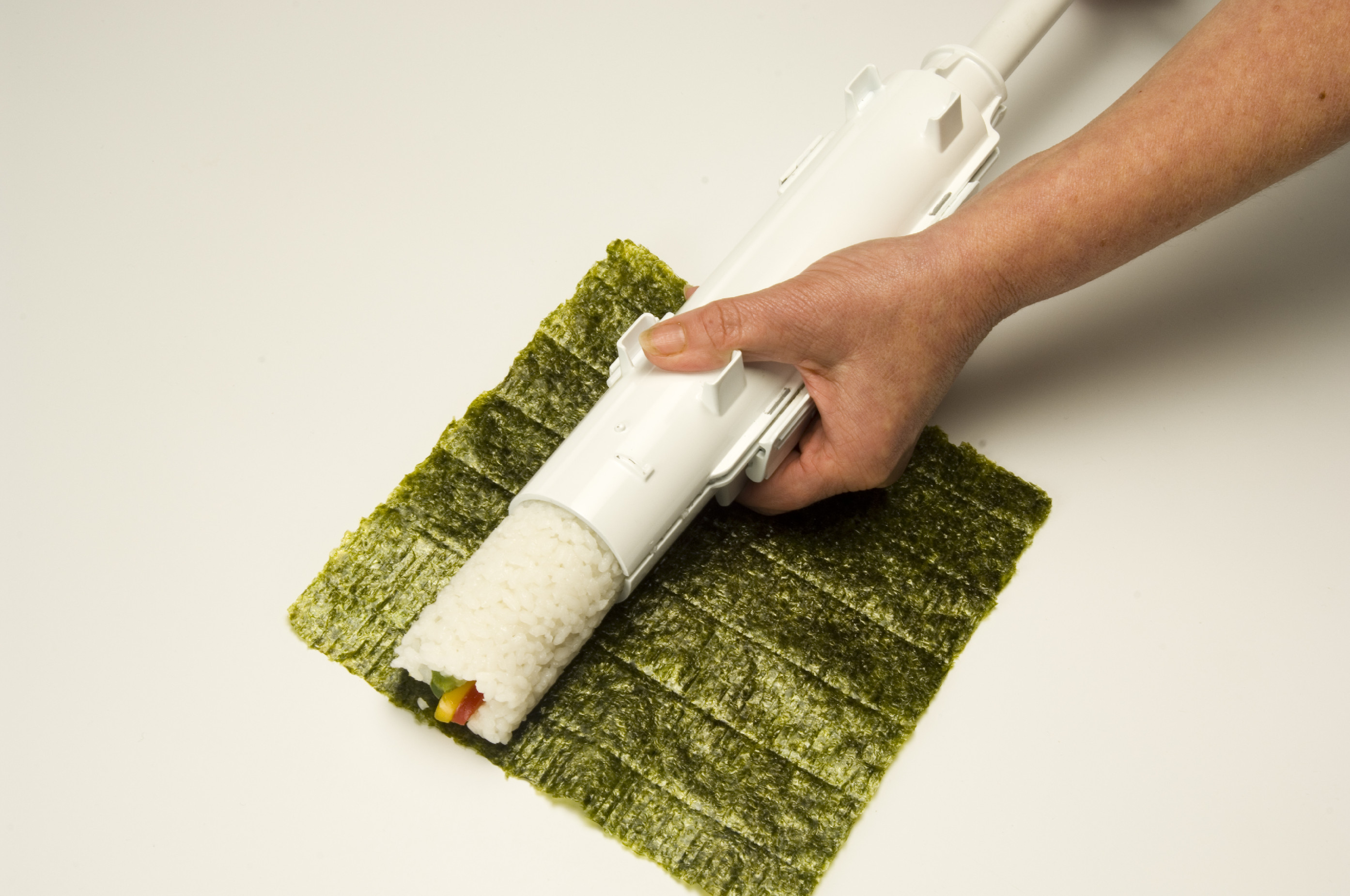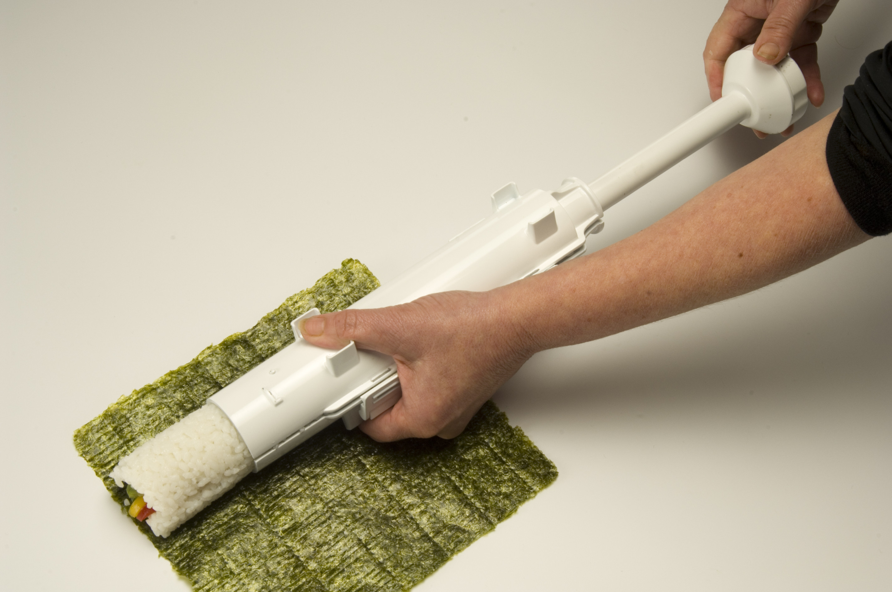 Uchopte SUSHEZI jednou rukou a druhou zašroubujete píst po značku na pístu (asi 5 otočení). Tím stlačíte směs do správné konzistence. Na konci pro-veďte stlačení pístu a jeho potažení zpět pro ujištění, že se píst již nenachází v závitu. - Otočením odemkněte závěr a vyjměte ho. Na stůl rozložte řasu nori. List řasy položte lesklou stranou (lícem) dolů. Tlakem na píst vytlačte rolku kolmo k ryskám na řase.