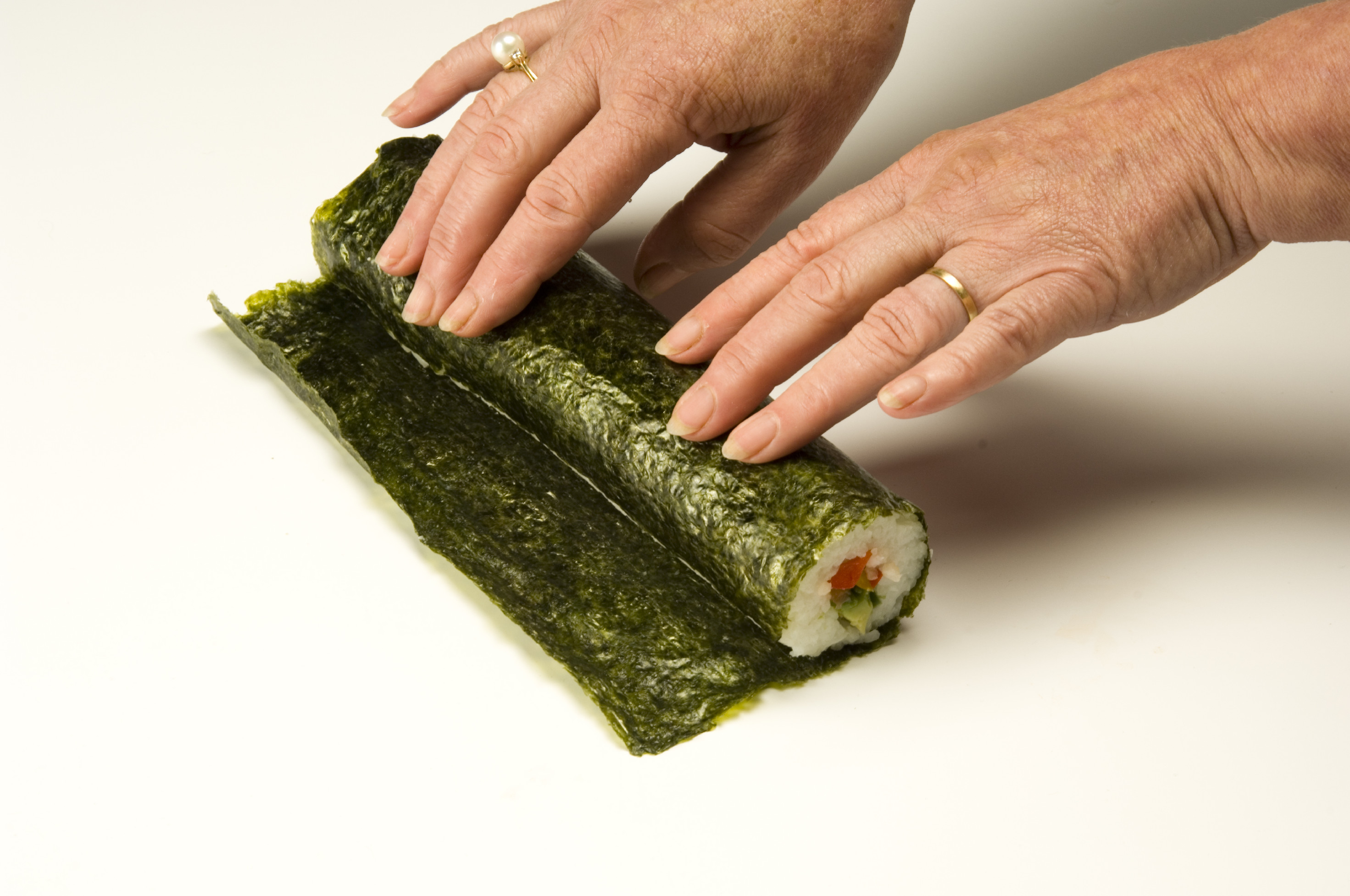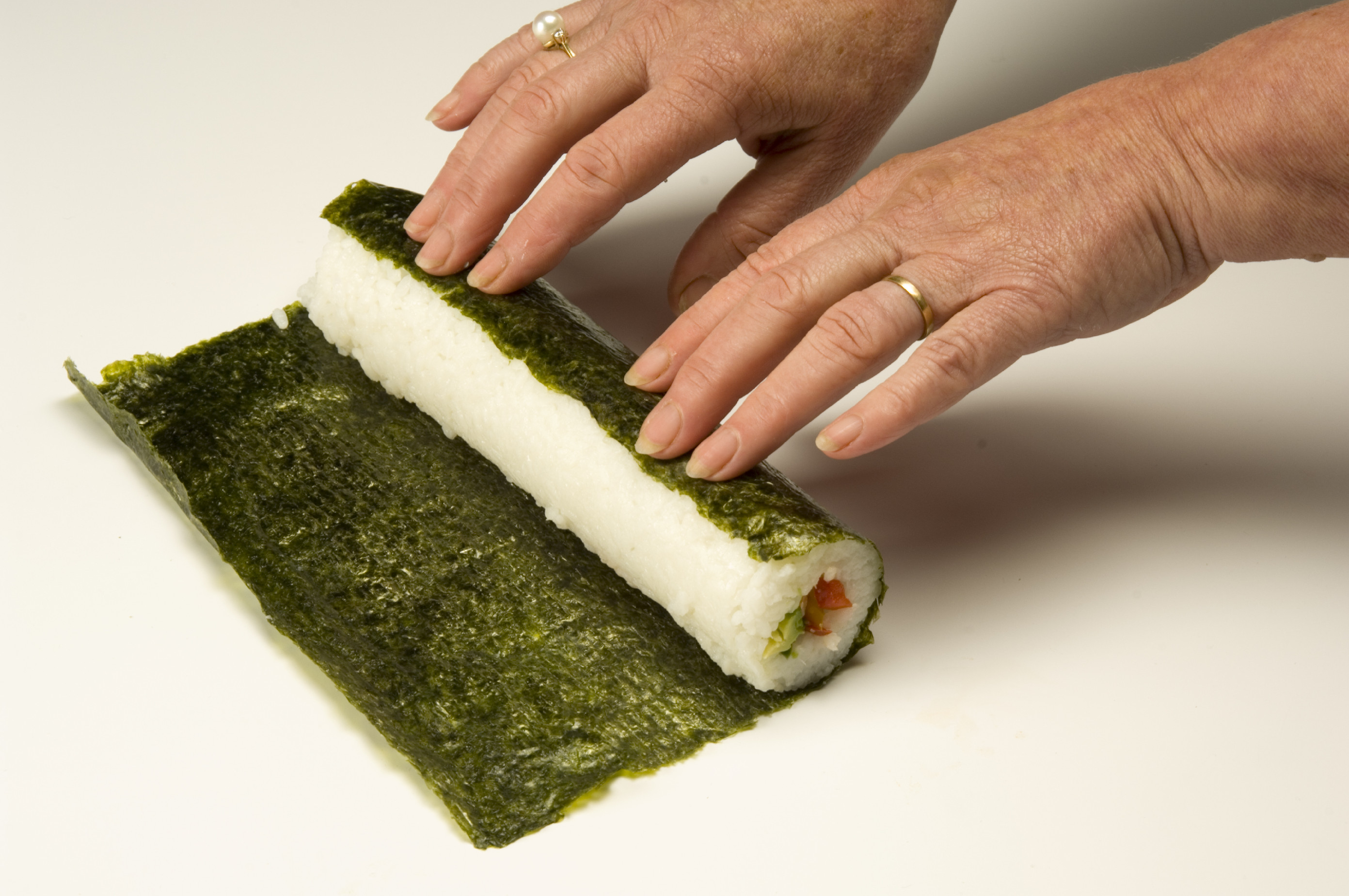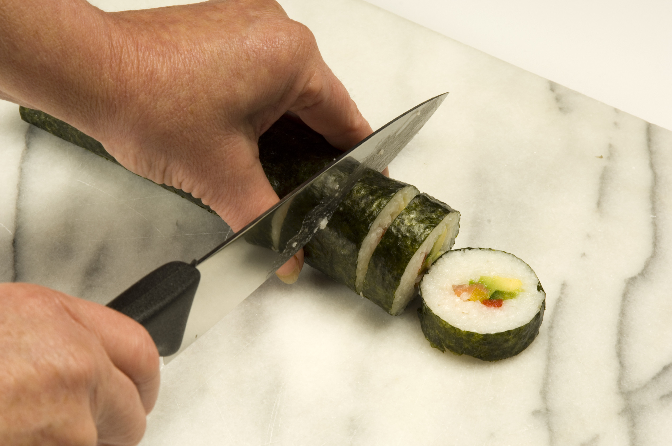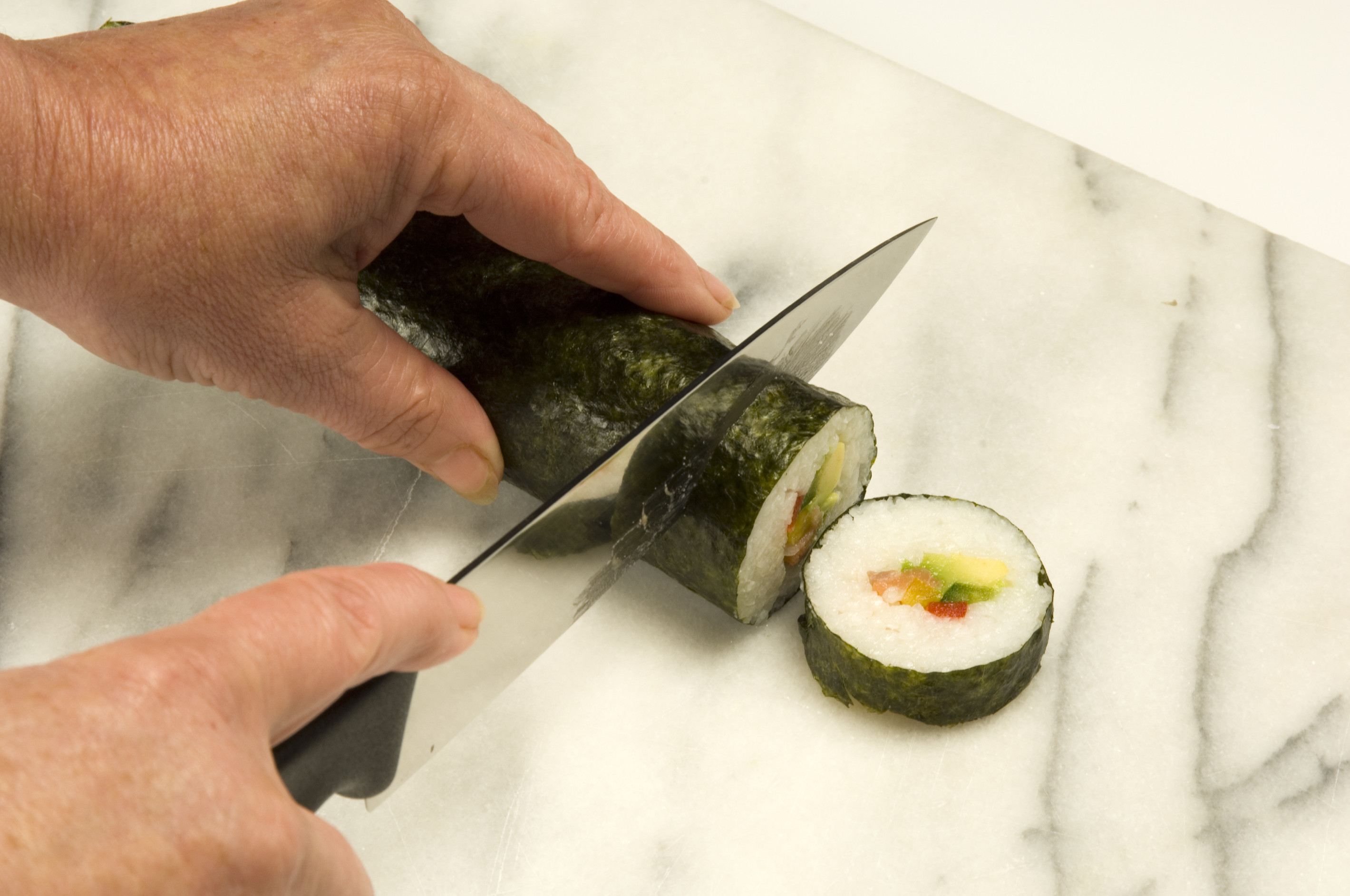 - Sushi můžete okamžitě krájet. Druhou možností je nechat sushi navlhnout asi 10 minut a poté ostrým a mokrým nožem nakrájet. Po každém řezu je dobré nůž otřít.
