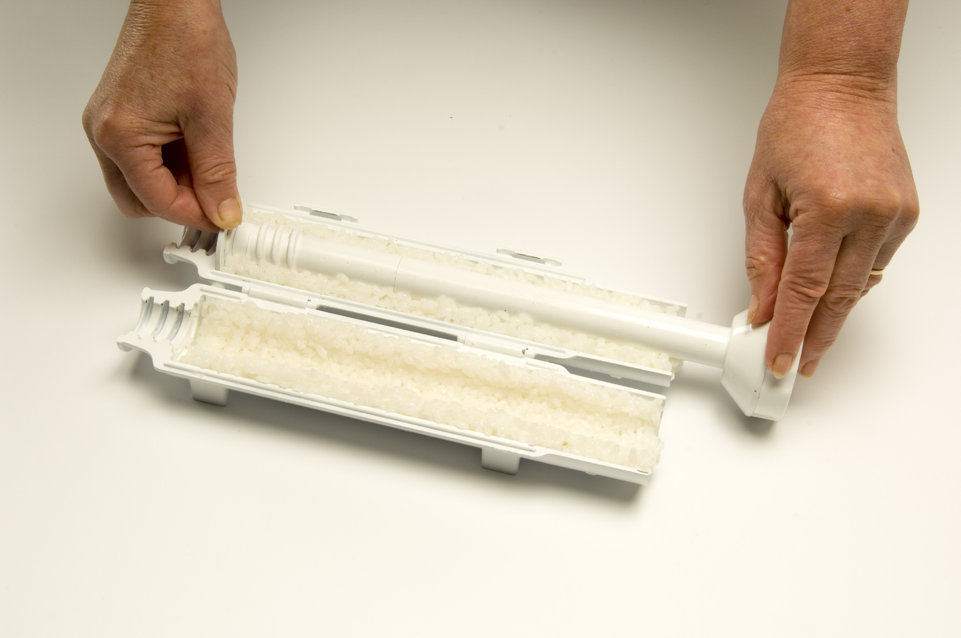 Ujistěte se, že píst sedí v závitu. - Postupně naplňte obě poloviny SUSHEZI rýží na sushi (půl šálku do každé poloviny SUSHEZI).