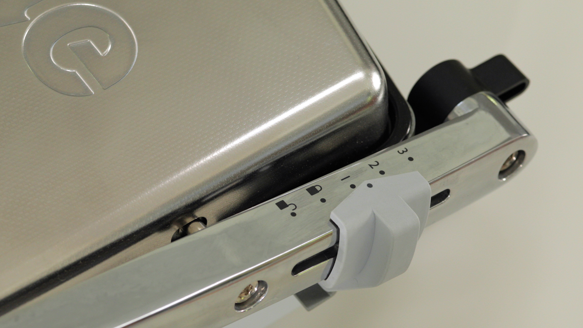 Pomocí pohyblivého pantu lze posunovat horní plotýnku. To vám umožní sendvičovač nastavit i tak, aby horní plotýnka nepřišla během pečení do kontaktu s pokrmem umístěným na spodní plotýnce. Horní plotýnku můžete posunout do 3 různých poloh v závislosti na tloušťce pečeného pokrmu a v závislosti na požadované vzdálenosti pokrmu od plotýnky.