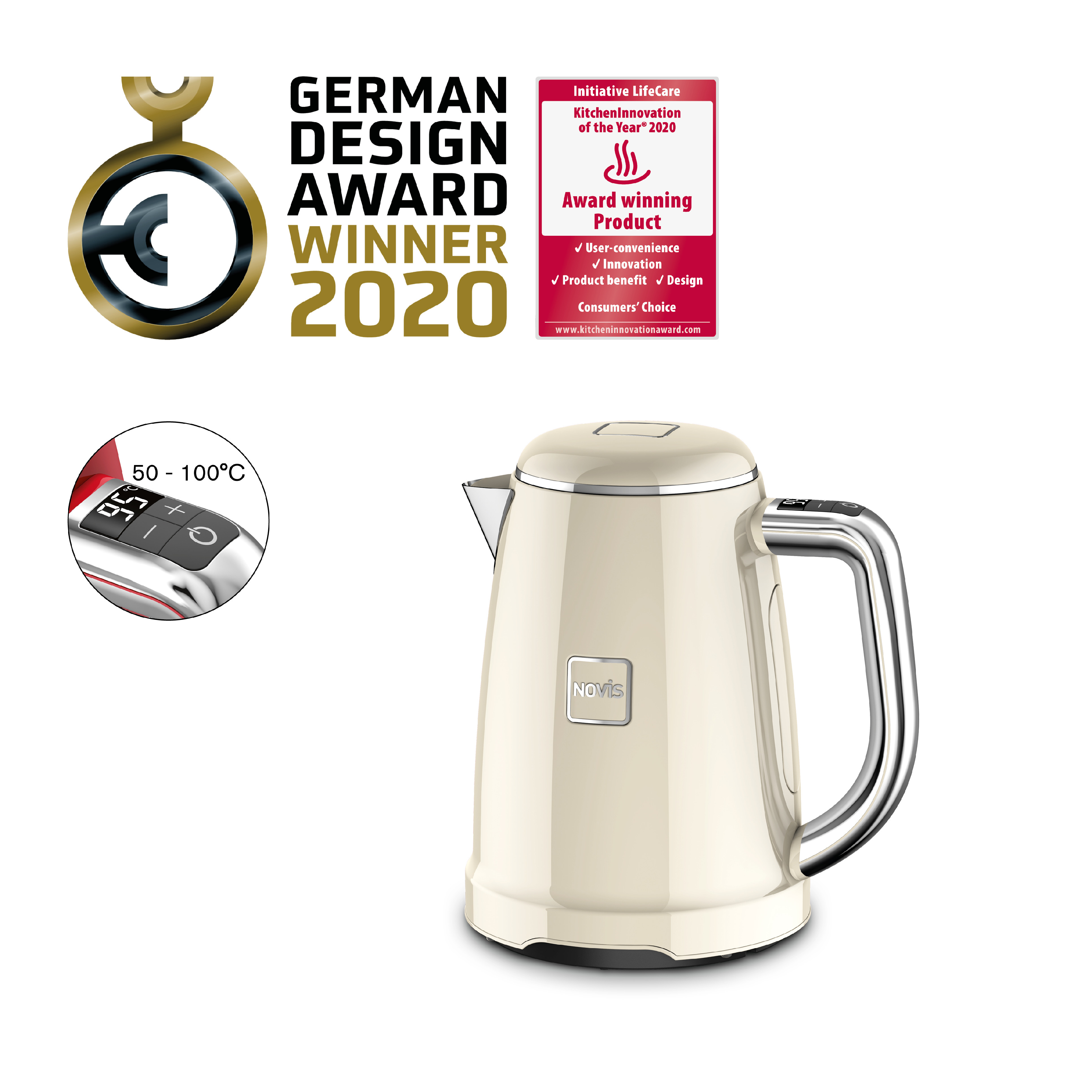 Atraktivní design rychlovarné konvice Novis Kettle KTC1 zaujal nejen zákazníky, ale i profesionály v oblasti designu, o čemž svědčí udělená cena German Design Award pro rok 2020. Konvice vyniká skvělým zpracováním a použitím kvalitních materiálů, kterým dominuje odolná nerezová ocel a prémiový lak v několika odstínech.
