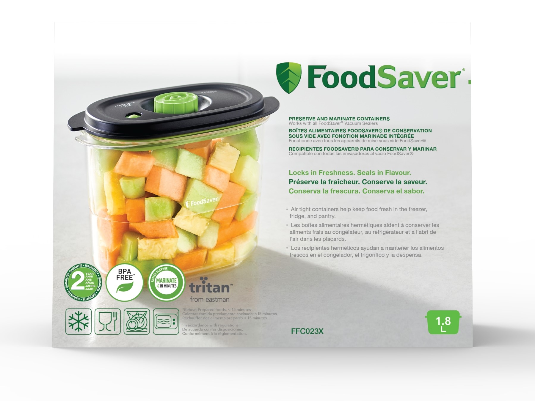 Tyto praktické dózy FoodSaver můžete stohovat (skládat do sebe i na sebe). Jsou vyrobeny z prvotřídního materiálu Tritan s extrémní trvanlivostí, takže nepraskají ani netrpí zabarvováním z uložených potravin ani nepřijímají pachy. Tyto nádoby mají vakuové těsnění s dlouhou životností, pružné víko se snadno otevíratelnými jazýčky a pro snadné čištění jsou vhodné do myčky. Můžete v nich i ohřívat jídlo v mikrovlnné troubě (pouze nádoba, ne víko). Křišťálově čisté nádoby jsou pod vakuem nepropustné, neobsahují BPA a fungují se všemi vakuovými uzavíracími systémy FoodSaver.