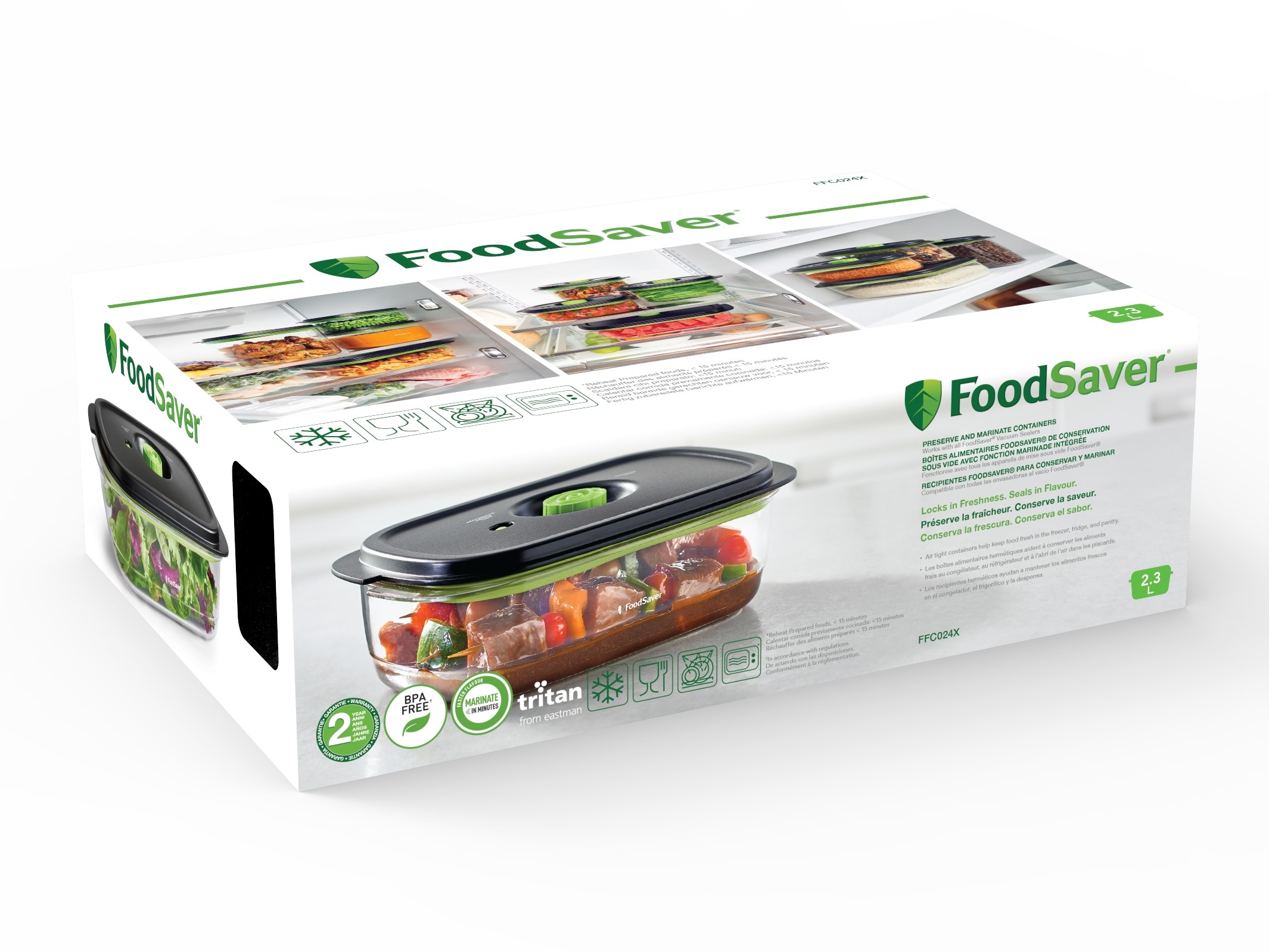 Tyto praktické dózy FoodSaver můžete stohovat (skládat do sebe i na sebe). Jsou vyrobeny z prvotřídního materiálu Tritan s extrémní trvanlivostí, takže nepraskají ani netrpí zabarvováním z uložených potravin ani nepřijímají pachy. Tyto nádoby mají vakuové těsnění s dlouhou životností, pružné víko se snadno otevíratelnými jazýčky a pro snadné čištění jsou vhodné do myčky. Můžete v nich i ohřívat jídlo v mikrovlnné troubě (pouze nádoba, ne víko). Křišťálově čisté nádoby jsou pod vakuem nepropustné, neobsahují BPA a fungují se všemi vakuovými uzavíracími systémy FoodSaver.