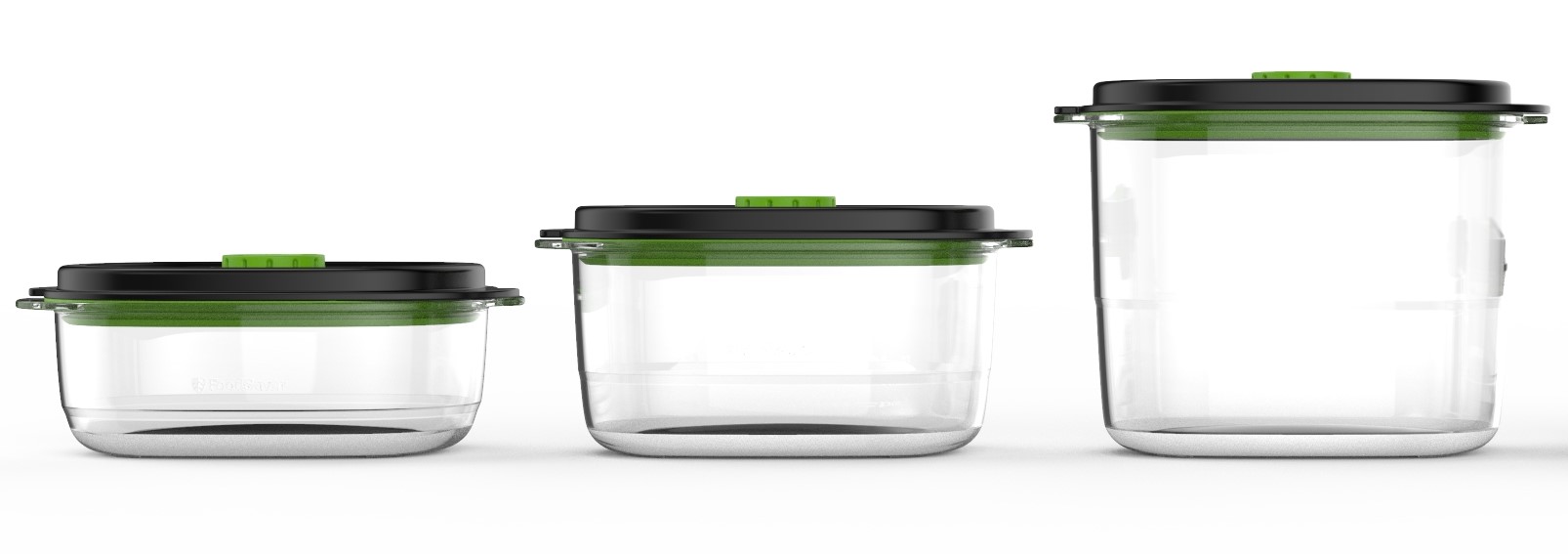 Tyto praktické dózy FoodSaver můžete stohovat. Jsou vyrobeny z prvotřídního materiálu Tritan s extrémní trvanlivostí, takže nepraskají ani netrpí zabarvováním z uložených potravin ani nepřijímají pachy. Tyto nádoby mají vakuové těsnění s dlouhou životností, pružné víko se snadno otevíratelnými jazýčky a pro snadné čištění jsou vhodné do myčky. Křišťálově čisté nádoby jsou pod vakuem nepropustné, neobsahují BPA a fungují se všemi vakuovými uzavíracími systémy FoodSaver. Dózy je možné použít pro ohřívání v mikrovlné troubě - pouze nádoby, nikoliv víka.