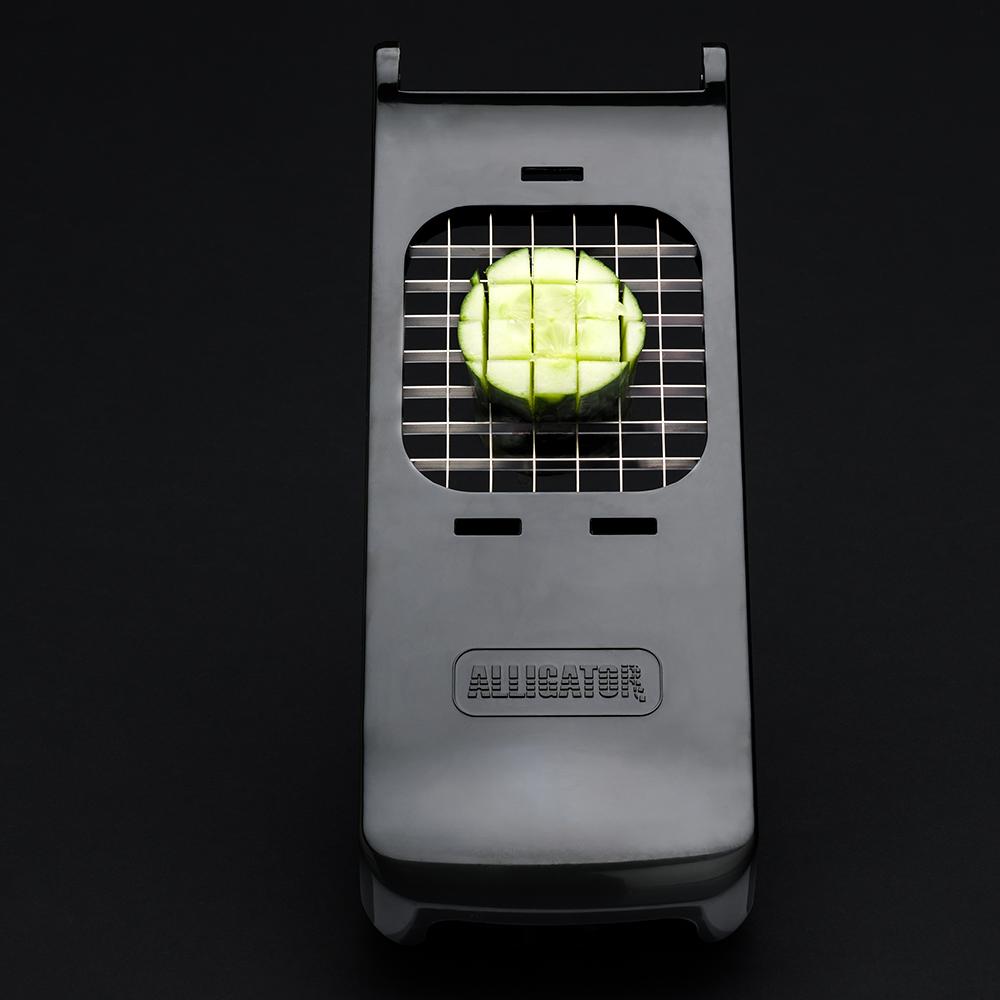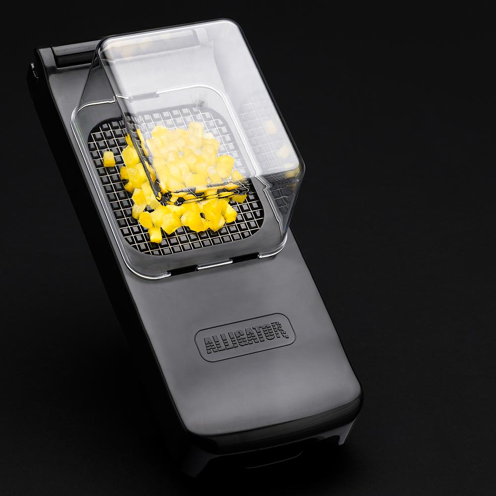 - Kráječ Alligator krájí tyčinky a kostky o rozměrech 6 mm x 6 mm, zásobník chytře pochytá vše, co je nasekané, na jedno místo.