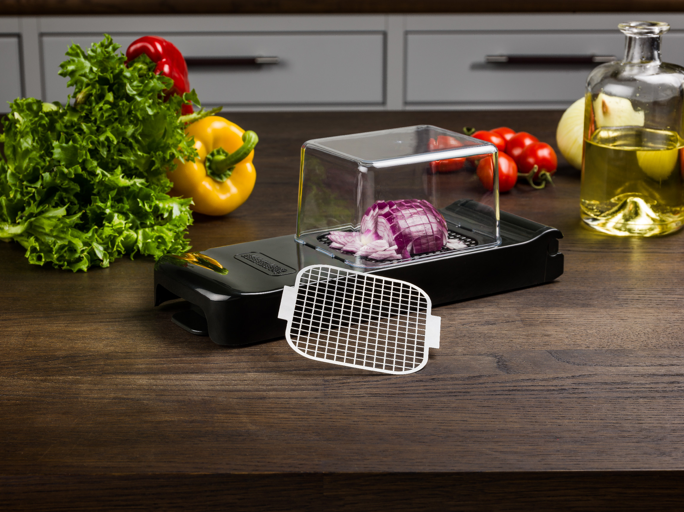 Mřížka z nerezové oceli o rozměrech 6 x 6 mm (1/4 ”) poskytuje skvělou každodenní standardní velikost. Nakrájejte cibuli, okurku a mrkev nebo si připravte salsu s paprikou a rajčaty nakrájenými na kostičky.