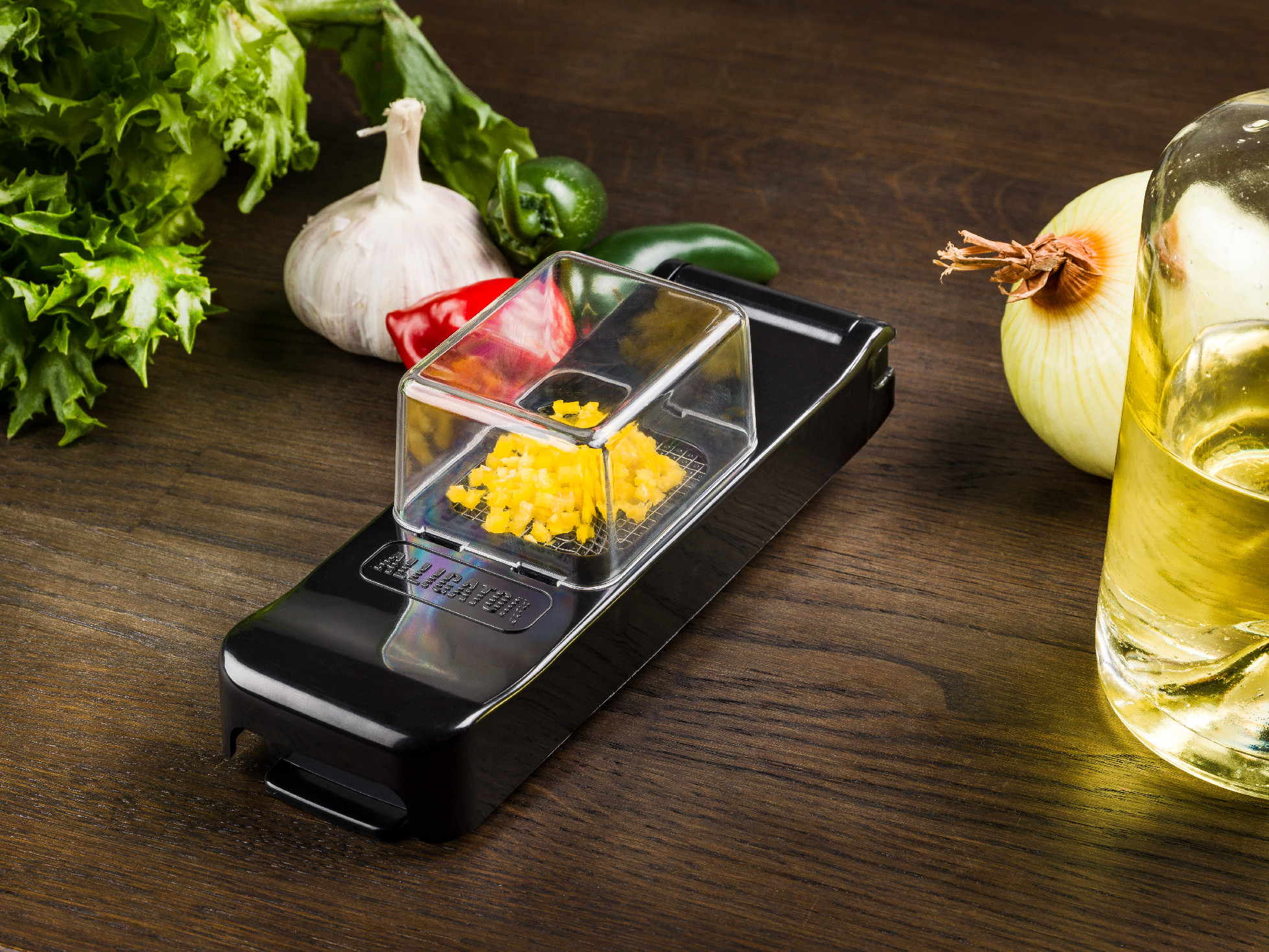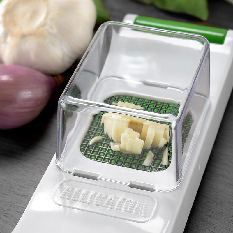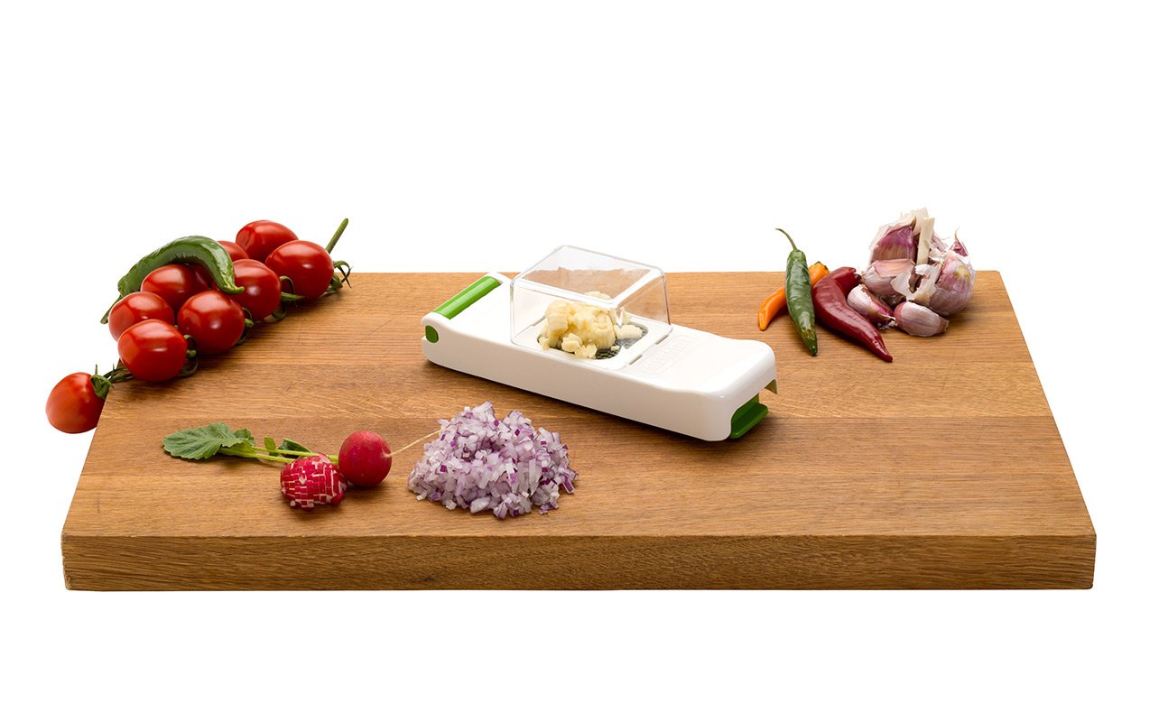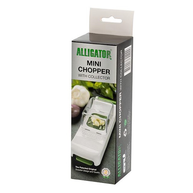 Kráječ Alligator Mini krájí tyčinky a kostky o rozměrech 3 x 3 mm. Je tak ideální pro krájení drobné zeleniny, jako např. česneku, chilli papriček apod. Kráječ je dodáván se zásobníkem, který chytře sbírá to, co jste nakrájeli. K dispozici je v černém provedení, nebo praktické bílo-zelené variantě.