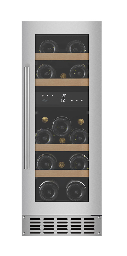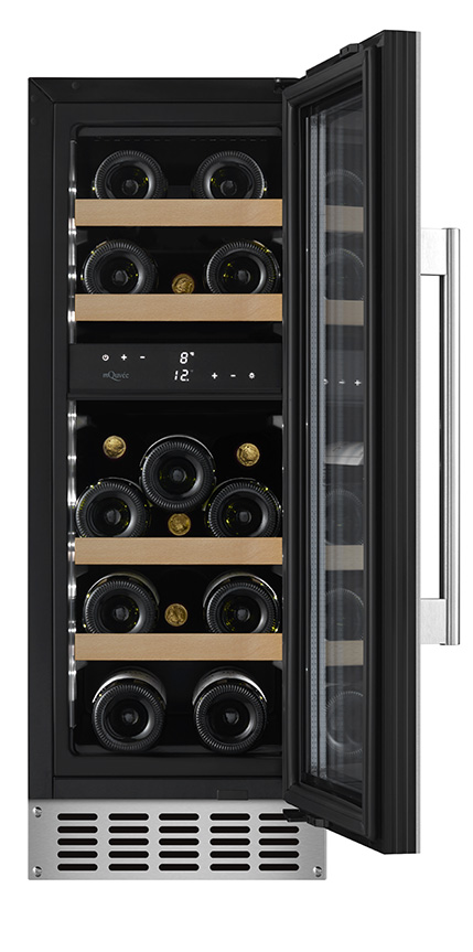 Vinotéka má dvě teplotní zóny a čtyři výsuvné dřevěné police s kapacitou pro 16 lahví. Digitální displej usnadňuje výběr požadované teploty a vnitřního LED osvětlení. Vinotéka je vybavena invertorovým kompresorem, který pracuje na tišší, rovnoměrnější úrovni zvuku, spotřebovává méně energie a umožňuje rychlejší obnovu teploty.