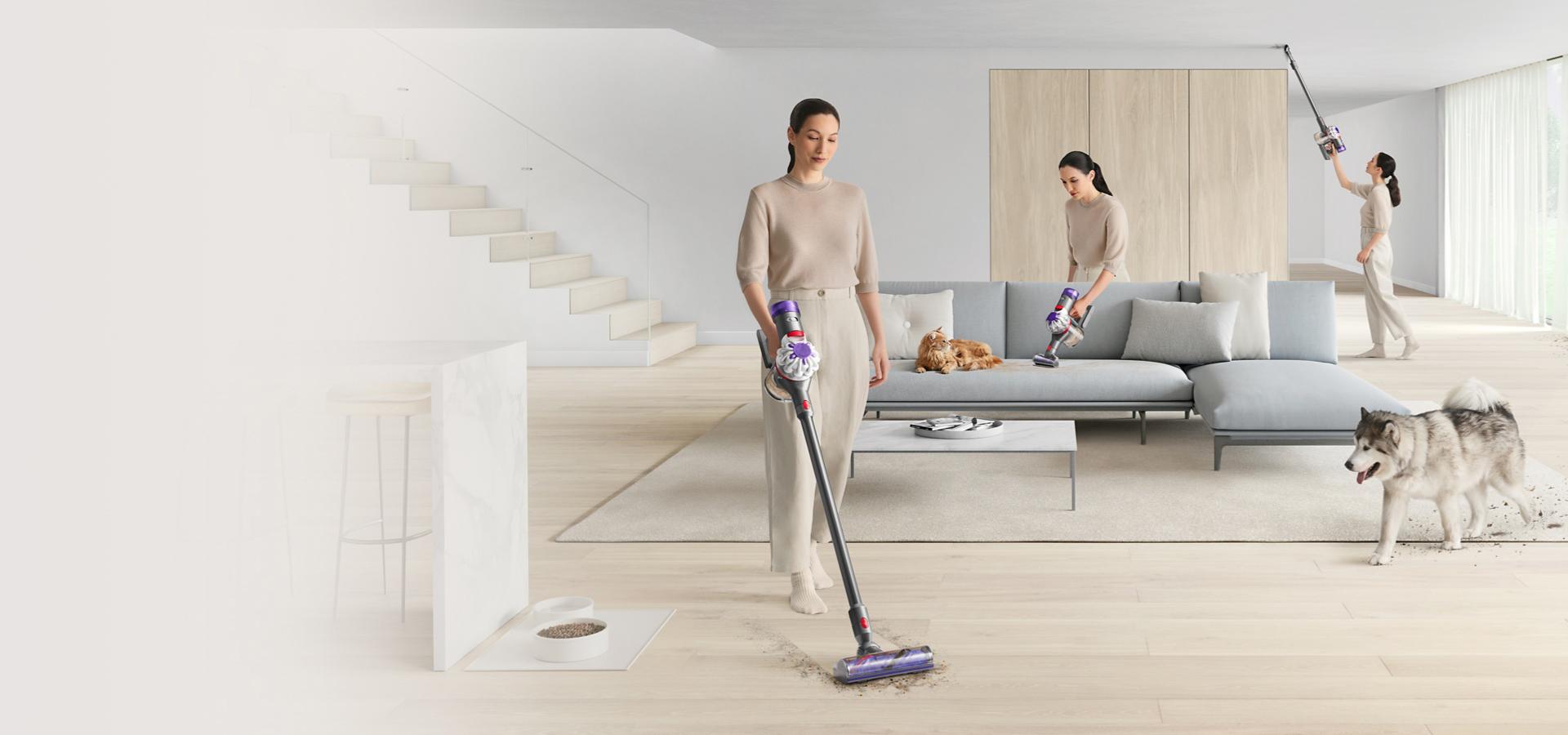 Vysavač Dyson V8 se zasouvá do úchytu na stěně, který slouží k nabíjení vysavače i úhlednému uložení příslušenství. Jedná se o praktické řešení, které je vždy po ruce. - Vysávání schodů