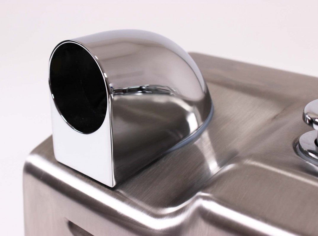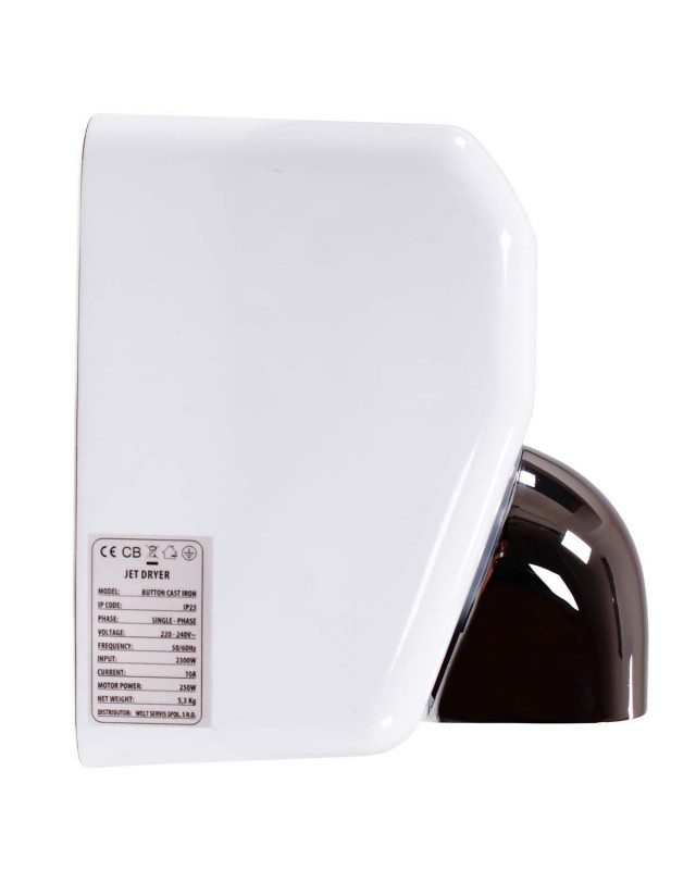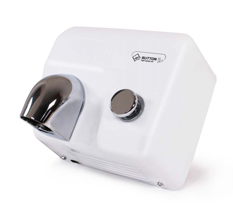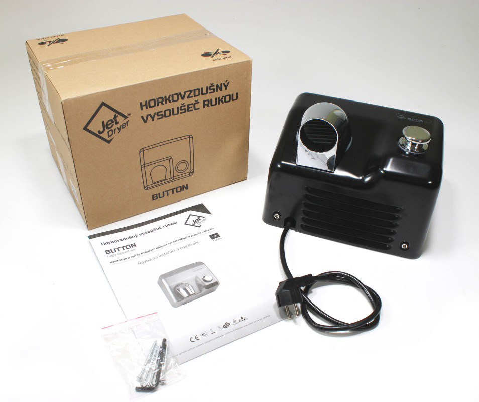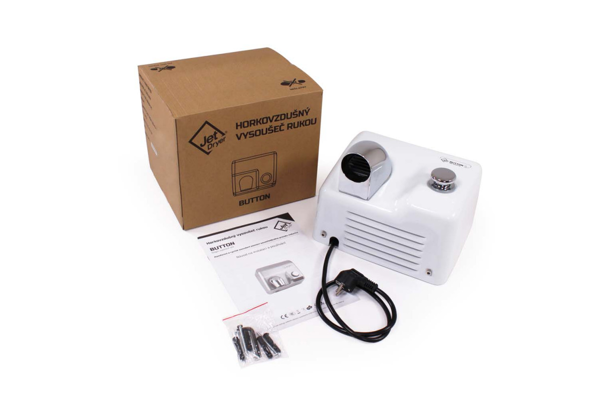 Tělo osoušeče Jet Dryer BUTTON je vyrobeno ze silného a velmi houževnatého kovu. Můžete si vybrat mezi provedením z lakovaného kovu nebo nerezové oceli. Kryt je fixován pomocí bezpečnostních šroubů. Pod osoušeč není možné nic zasunout a strhnout jej ze zdi.