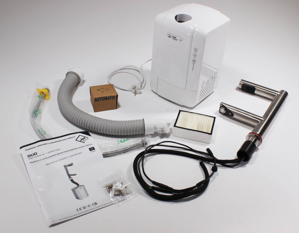 Vzduch procházející vysoušečem je pročištěn HEPA filtrem se schopností zachytit přes 99,9 % částic o velikosti bakterií a virů. V kombinaci se zcela bezkontaktním použitím je tak baterie s vysoušečem Jet Dryer DUO maximálně hygienická.