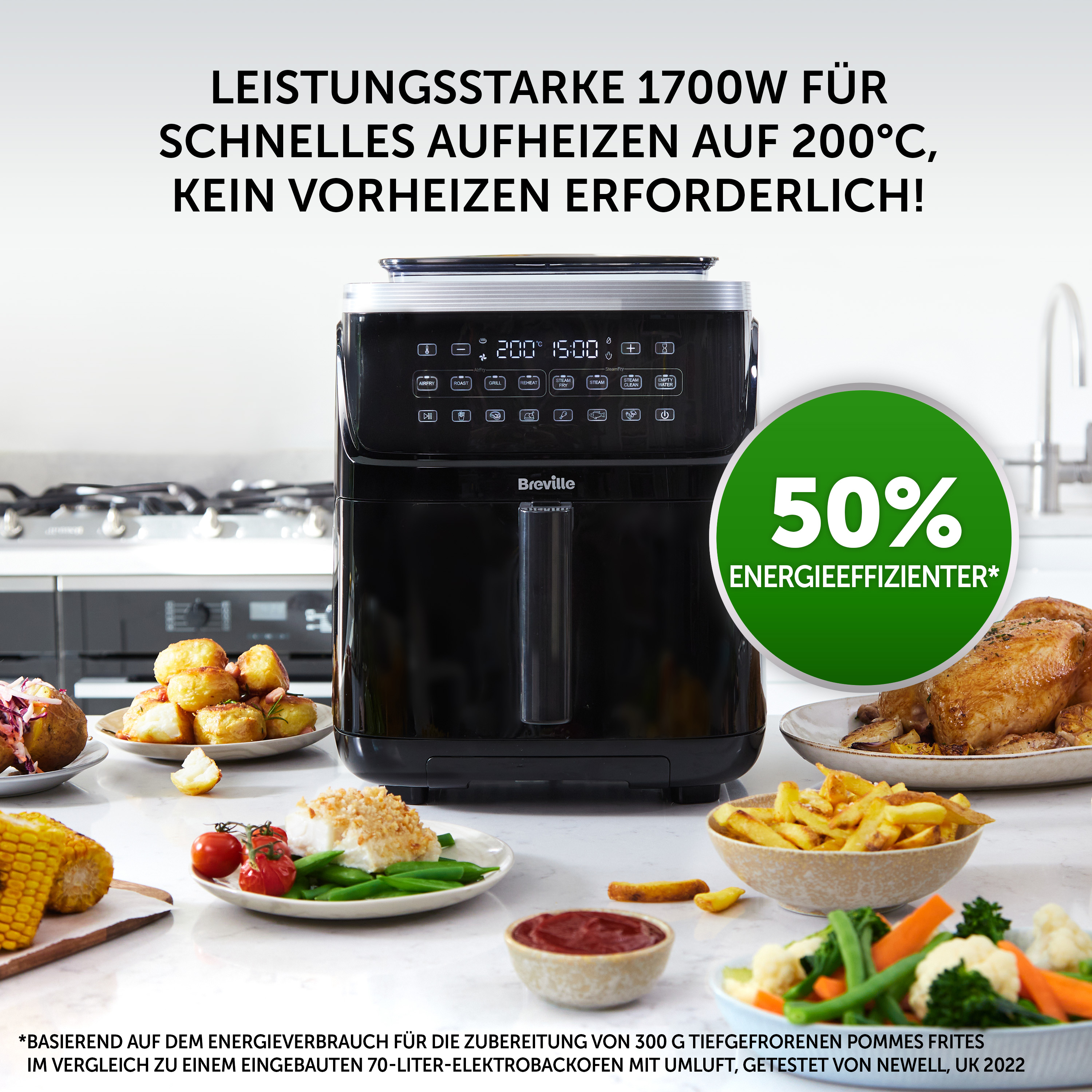 RYCHLÉ A SNADNÉ POUŽITÍ: Výkonných 1700 W pro rychlý ohřev až na 200 °C, nastavitelný 90minutový časovač a dotykové ovládání pro teplotu a přednastavené režimy vaření. Zásobník na vodu o objemu 1,4 l poskytuje až 90 minut nepřetržité páry.
