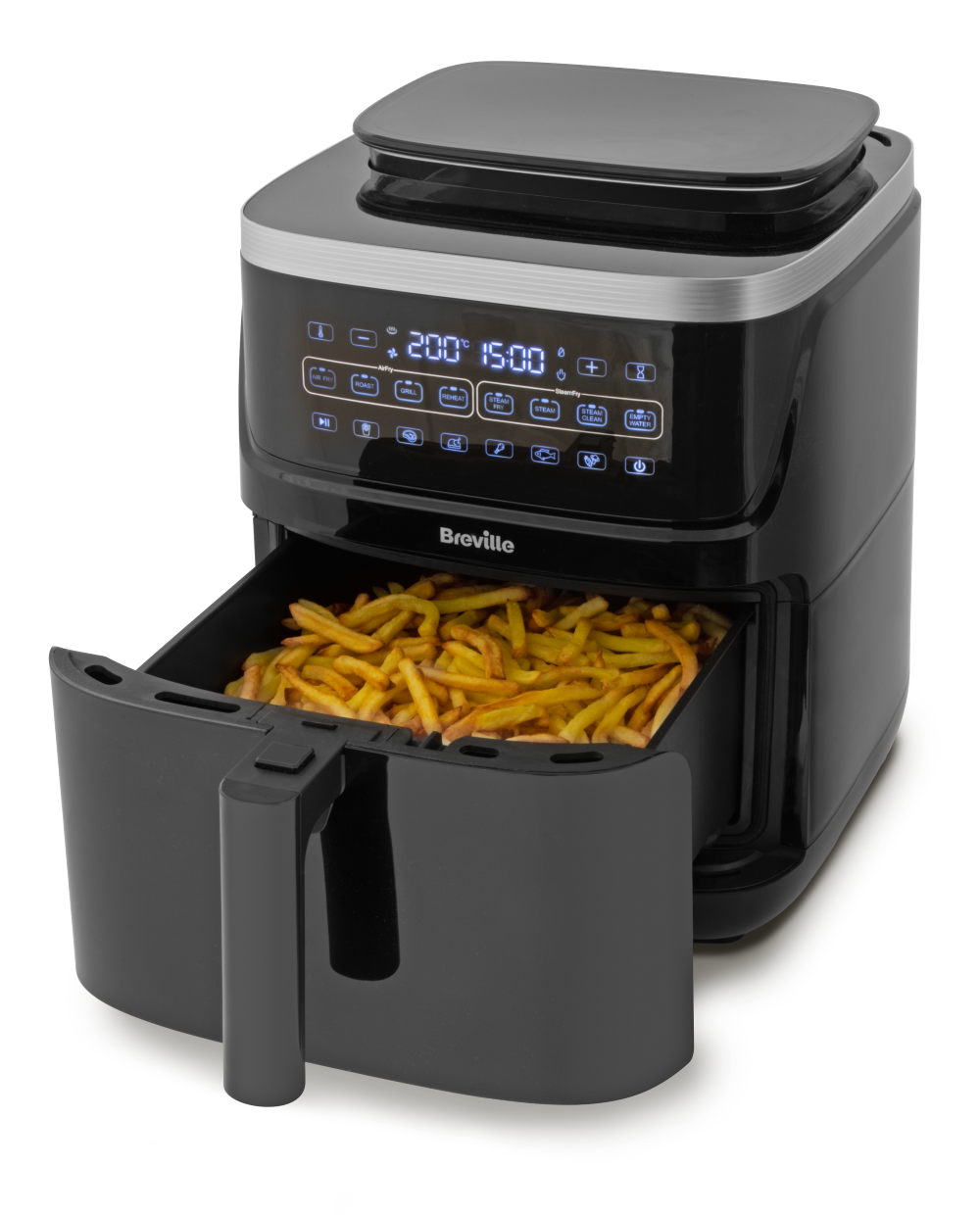 Digitální fritéza Breville Halo Steam 7 l s 360° cirkulací vzduchu. Použijete o 99,5 % méně oleje oproti tradičnímu smažení.