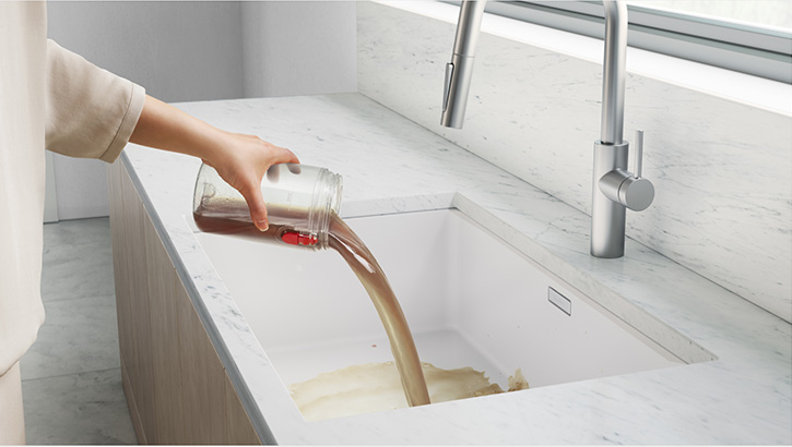 Jedinečný systém automaticky odděluje pevné nečistoty od špinavé tekutiny – pro hygienickou bezdotykovou likvidaci.
