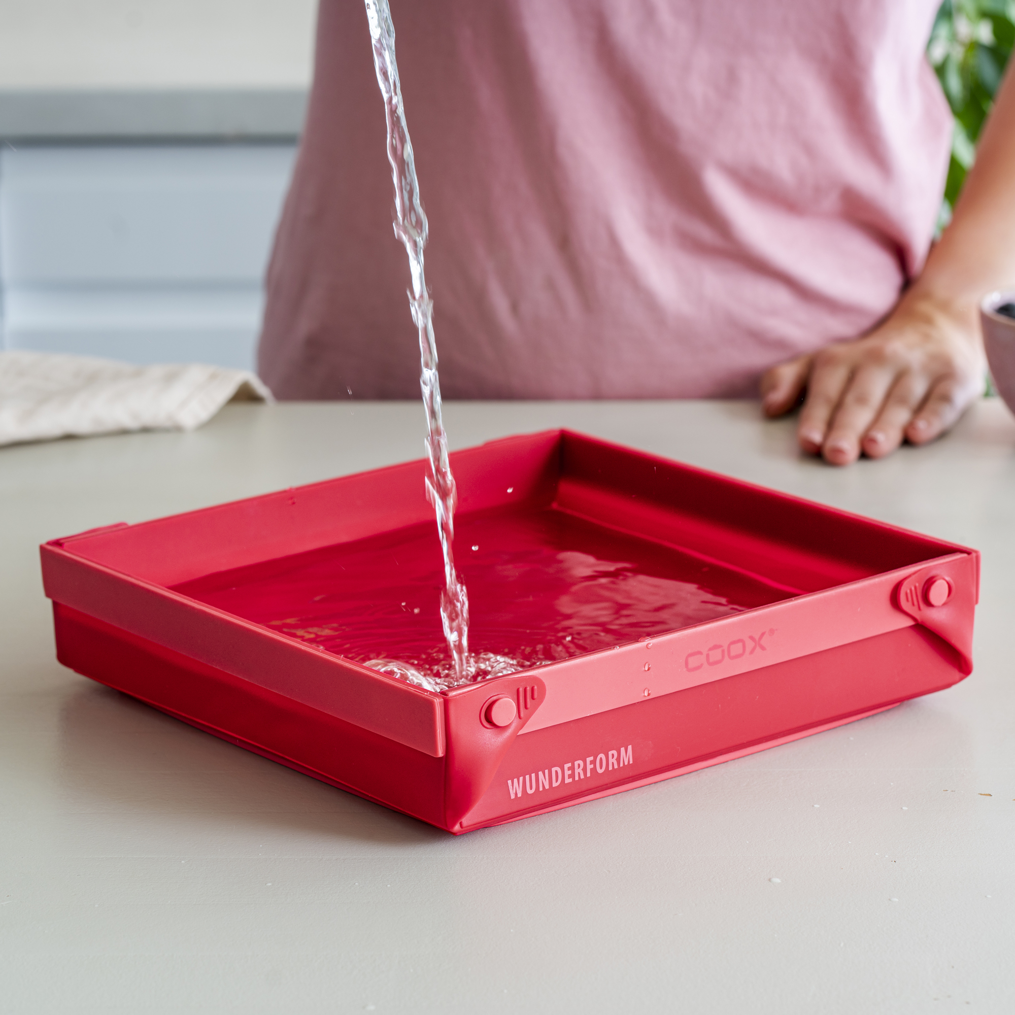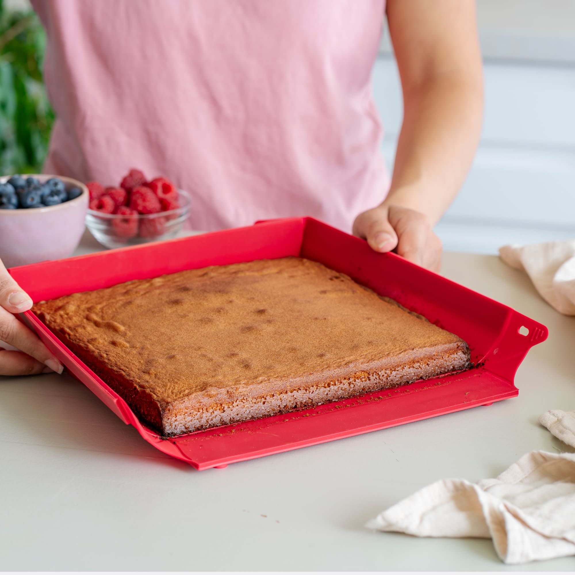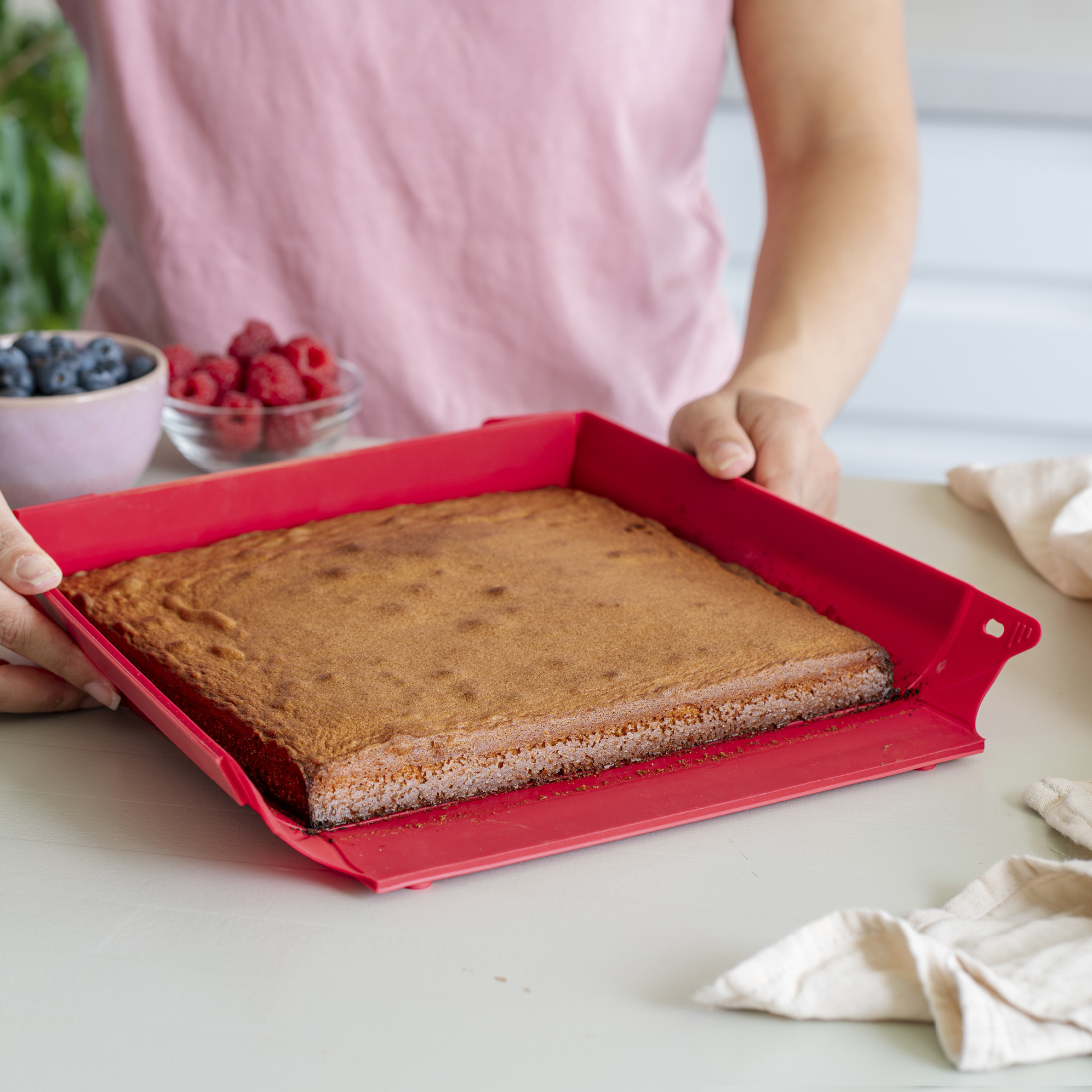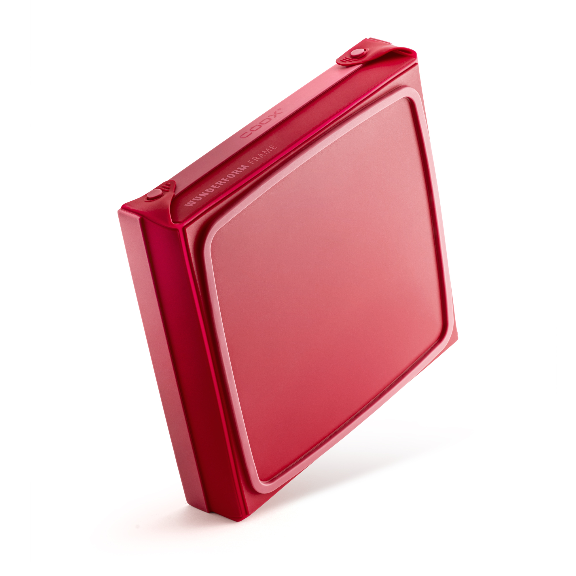 Revoluce v pečení! Rozkládací forma coox WUNDERFORM Frame MQ změní způsob, jak připravujete sladká i slaná jídla. Díky skládacím rohům formu snadno rozevřete a dort, chléb či zapečené jídlo nemusíte vyklápět – jednoduše servírujete přímo z formy. Kovové výztuže zajišťují pevnost, silikonový materiál s antiadhézní úpravou maximální komfort. Pro bezpečné krájení přímo na silikonové formě můžete využít speciální multifunkční nástroj. Případně lze formu pro snadný transport a skladování doplnit o plastové víko.