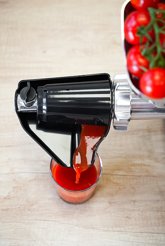 Protlaky, šťávy, kečupy nebo dětskou výživu teď připravíte bez otravného krájení a loupání. Lis jednoduše nasadíte na elektrický mlýnek a udělá to za vás!