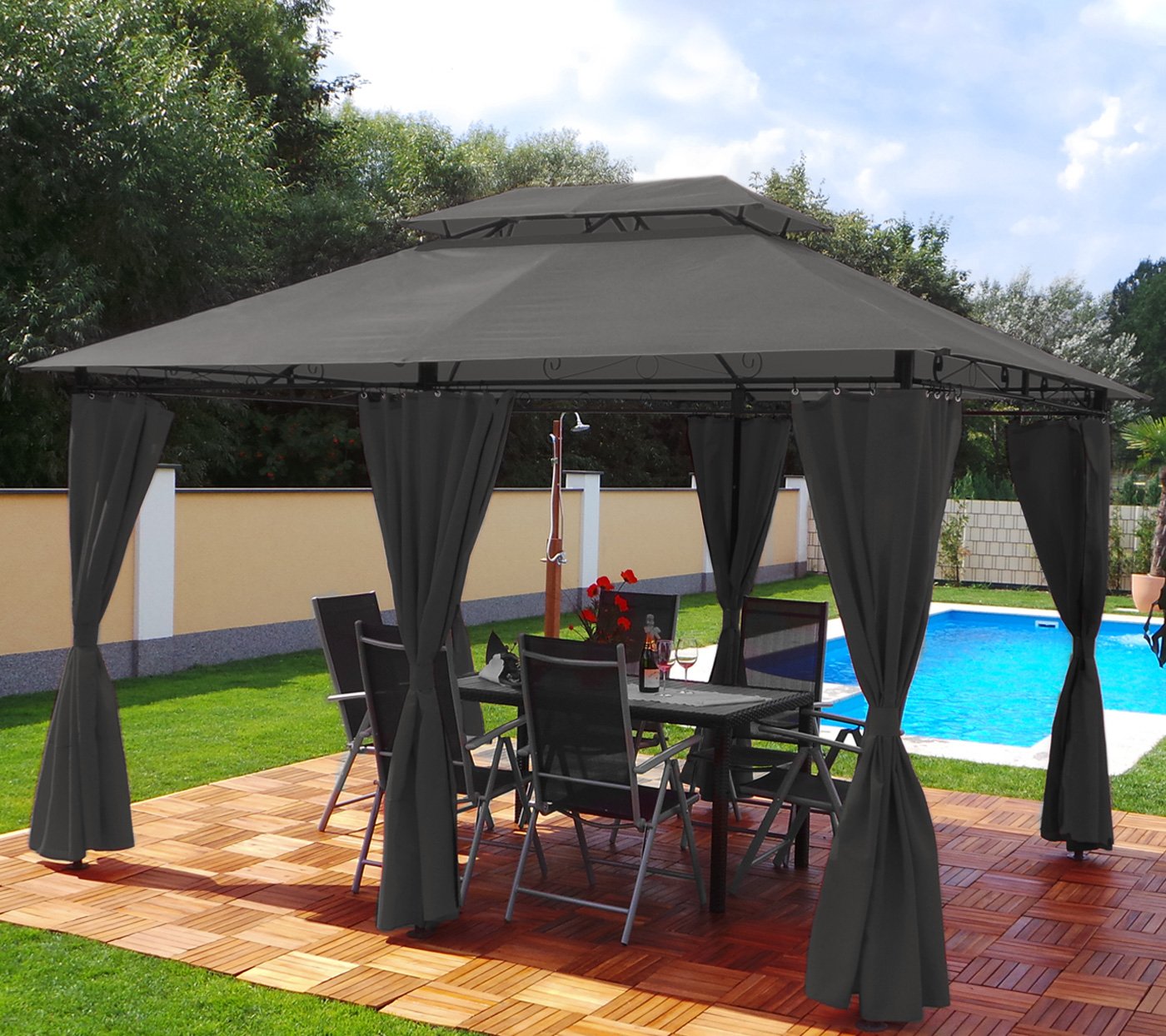 Představte si zahradní altán, který je dokonalým místem pro relaxaci ve vaší zahradě. Vytvořte si ideální místo pro odpočinek, zábavu nebo prostě jen pro chvíle klidu s rodinou i přáteli. Zahradní altán je tou pravou volbou pro každou rodinu, kterou okouzlí kombinace odolnosti, funkčnosti a moderního designu. Altán poskytuje stín v horkých letních dnech a ochranu před deštěm, což vám dodá možnost venkovního posezení i při méně příznivém počasí.
