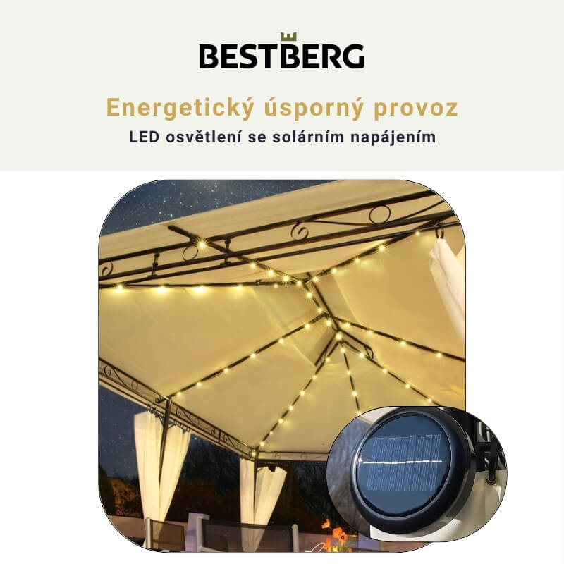 Zahradní altán s LED solárním osvětlením BestBerg BBGG-11 je ideální volbou pro každého, kdo si chce na zahradě užít klid a pohodu. Tento altán poskytuje stín v horkých dnech a ochranu před deštěm. Vy si tak můžete užívat venkovní posezení i při nepříznivém počasí. Kombinace odolnosti, funkčnosti a elegantního designu z něj dělá dokonalý doplněk pro vaši zahradu.