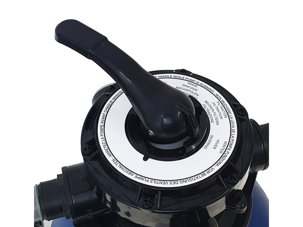 Díky 4cestnému ventilu máte k dispozici různé možnosti nastavení, které lze libovolně nastavit. Jedná se o filtrování, zpětné proplachování (čištění filtru), oplachování (odstranění nerozpuštěných látek v písku), zima (pro uvolnění těsnění). Spoje systému jsou navrženy s průměrem 32 nebo 38 milimetrů, takže lze použít všechny běžné hadice.