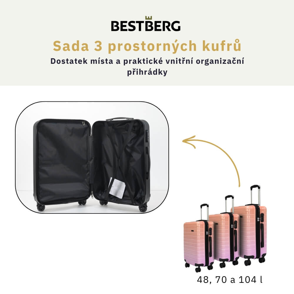 Hledáte praktické kufry na uložení a převoz vašich osobních věcí během cestování? Elegantní sada 3 odolných kufrů BestBerg v elegantní gradientní růžové barvě vás nadchne svou kvalitou, zabezpečením i velkorysým úložným prostorem.