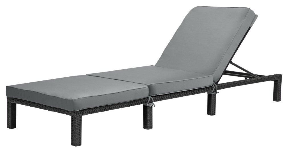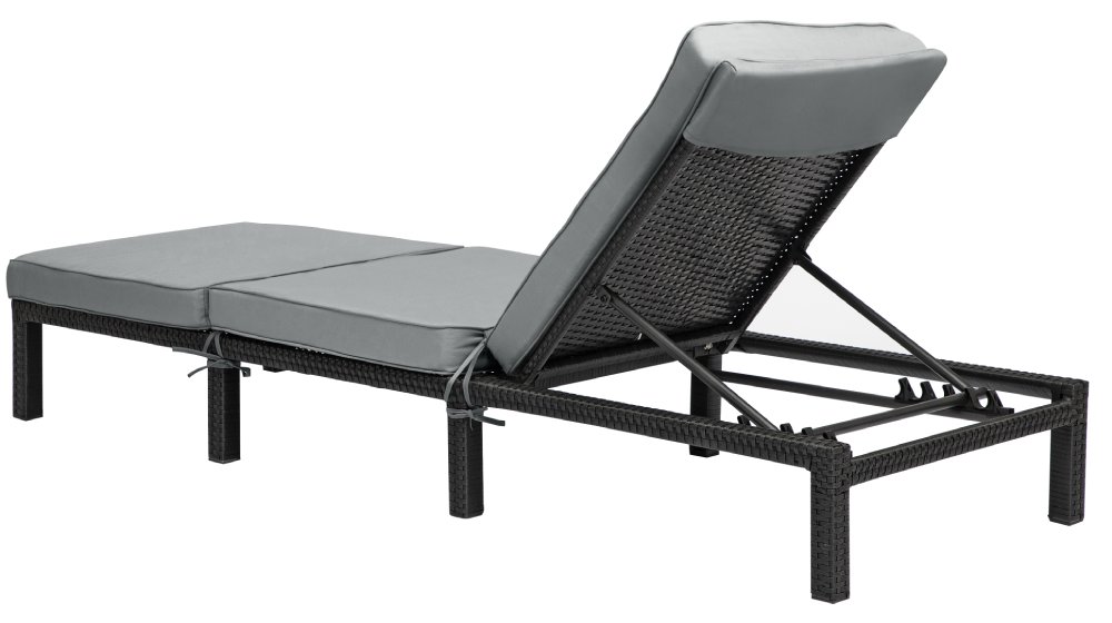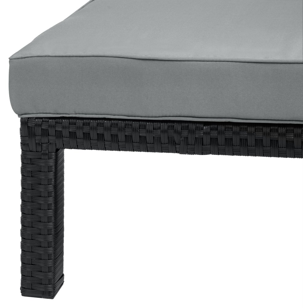Elegantní ratanové lehátko v nadčasové kombinaci černého ratanu a šedých polštářků – ideální volba pro stylový venkovní odpočinek.
