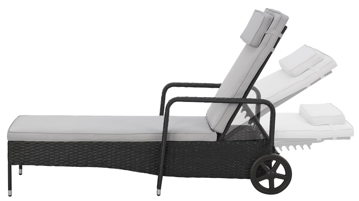 Stylové ratanové lehátko s praktickými kolečky a možností polohování – ideální pro odpočinek na zahradě, terase nebo u bazénu.