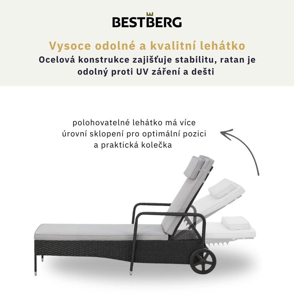 Kvalitní a odolné provedeníKonstrukce z oceli s práškovým lakem zajistí stabilitu a dlouhou životnost. Povrch tvoří PE ratan, který odolá UV záření, vlhkosti i mechanickému opotřebení. TIP: Díky odolnému materiálu je lehátko bezúdržbové a vždy připravené k použití.