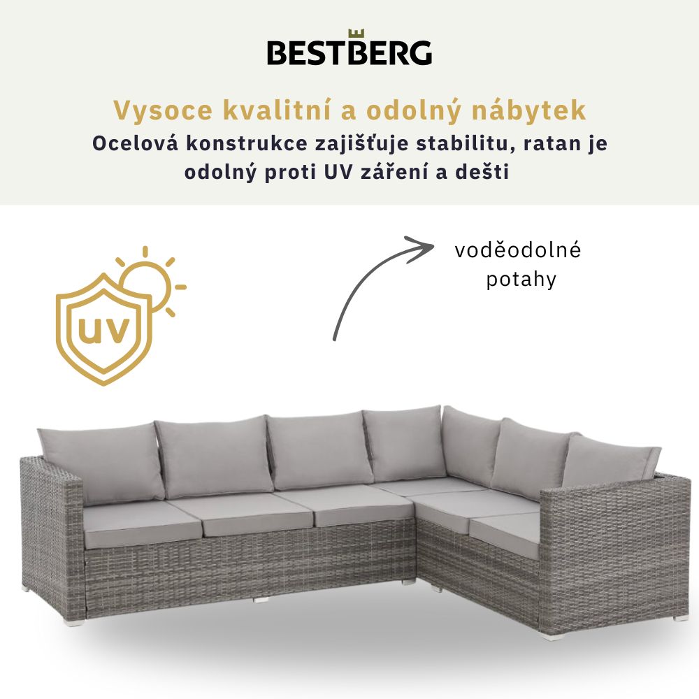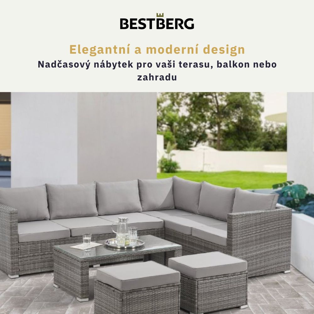 Chcete si na terase nebo zahradě vytvořit stylový rohový kout pro pohodlné posezení i relaxaci? Tento moderní ratanový set BestBerg v šedé barvě je ideální volbou – spojuje funkčnost, odolnost a design v jednom.