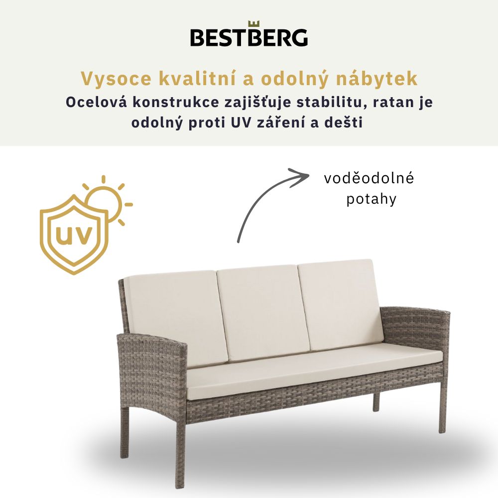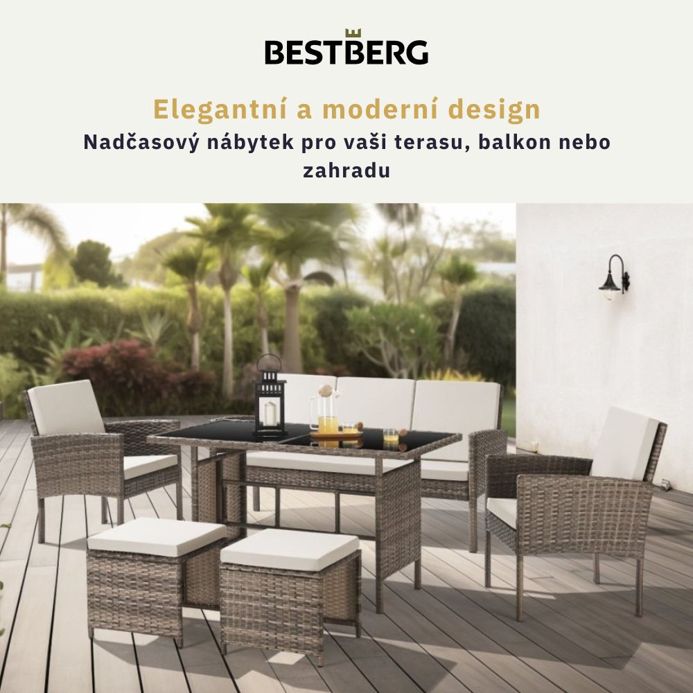 Hledáte kompletní zahradní set pro stylové a pohodlné posezení? BestBerg Denver kombinuje elegantní design, odolné materiály a vysoký komfort. Díky sedačce, křeslům, podnožkám a prostornému stolu vytvoříte perfektní místo pro odpočinek i zábavu.