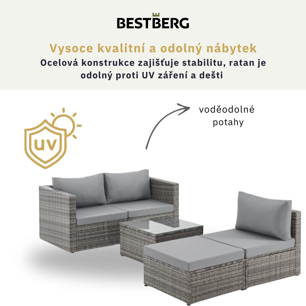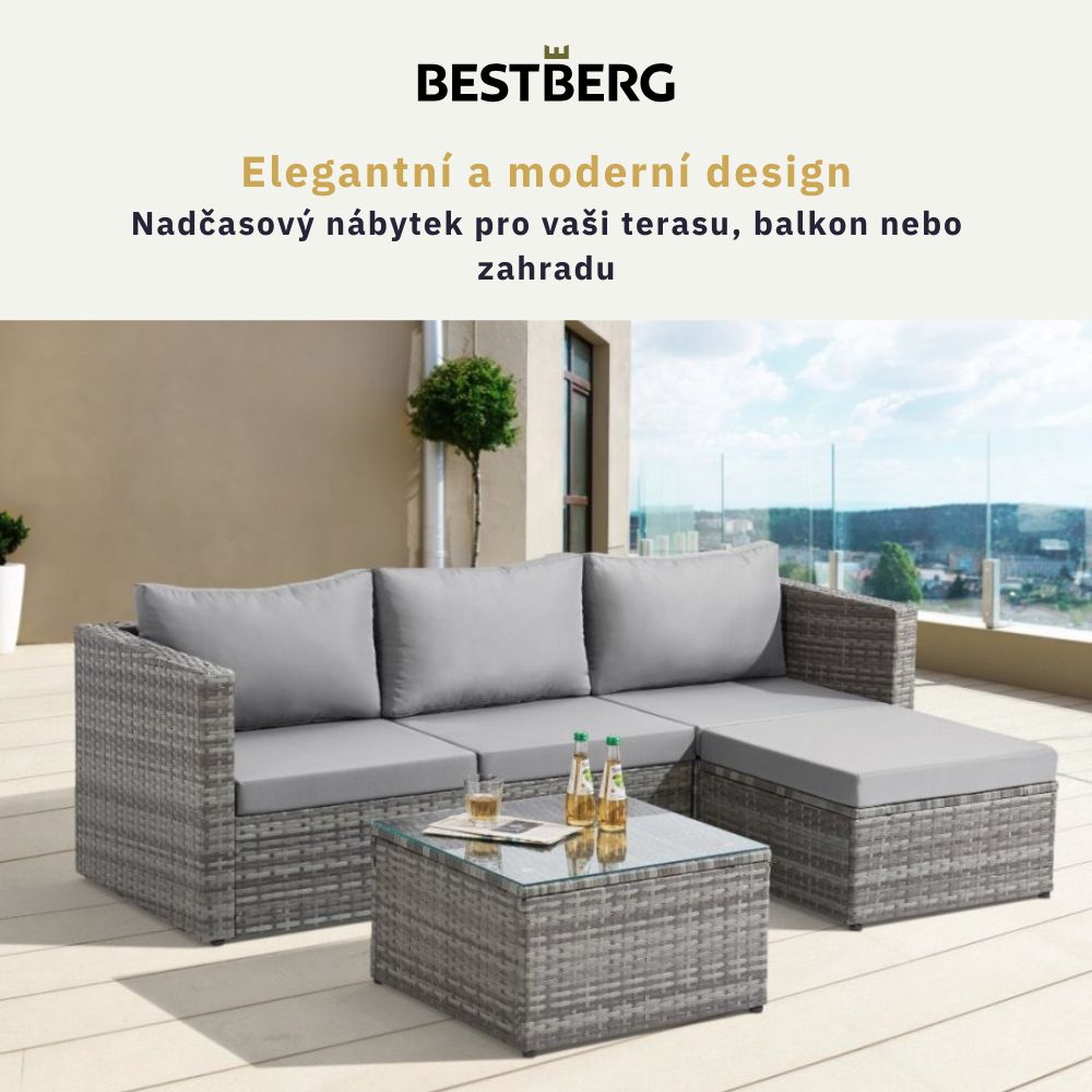 Chcete si vytvořit pohodlný koutek pro relaxaci nebo posezení s rodinou? Ratanová souprava BestBerg Newport nabízí moderní vzhled, komfort a odolnost. Díky modulárnímu designu ji snadno přizpůsobíte i menším prostorům.