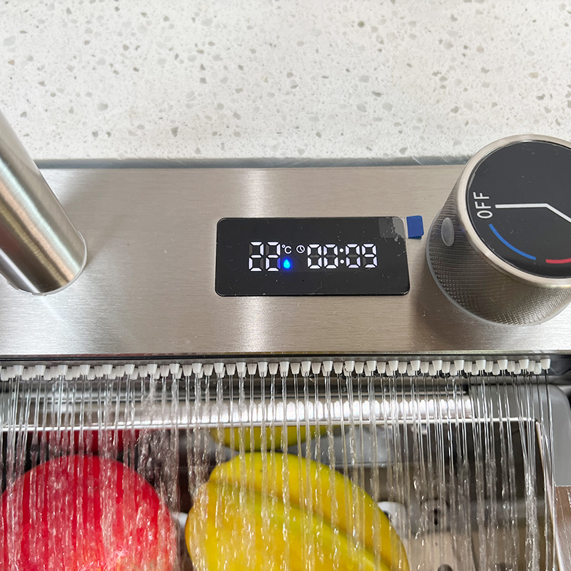 Zobrazení teploty pomáhá předcházet popáleninám a opaření. Otočný knoflík pro regulaci teploty a zapnutí/vypnutí přidává pohodlí a přesnost. Umožňuje snadné a intuitivní nastavení teploty vody podle vašich potřeb.