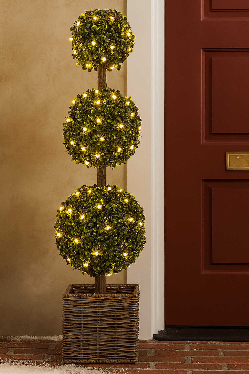 Vneste do svého domova či na terasu nádech elegance s tímto stylovým umělým stromkem v květináči. Jeho dokonale tvarované tělo tvoří tři zelené koule o průměrech 18 cm, 22 cm a 28 cm, které vytvářejí harmonický a moderní vzhled. Stromek stojí v pevném květináči o rozměrech 20×20×20 cm a s ním dosahuje výšky 100 cm – ideální velikost pro umístění u dveří, na terase nebo v interiéru. Jemné teplé osvětlení z integrovaného světelného řetězu s certifikací IP44 na 3× AA baterie dodá stromku útulnou atmosféru. Díky praktickému časovači se světla automaticky zapínají na 6 hodin a poté na 18 hodin vypínají. Dekorace je vhodná pro použití jak uvnitř, tak venku a rozzáří váš prostor po celý rok.