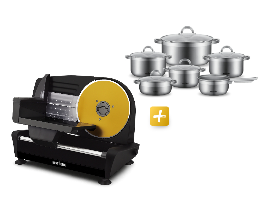 MEGAKOMBO Elektrický kráječ BestBerg BBS-400B + 11dílná sada nerezových hrnců BestBerg BBSC-11