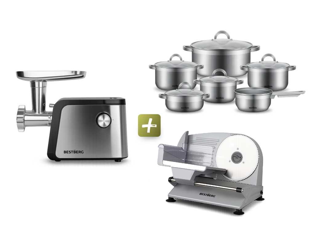MEGAKOMBO Elektrický kráječ BestBerg BBS-400 + 11dílná sada nerezových hrnců BestBerg BBSC-11 + Elektrický mlýnek na maso BestBerg BBM-2500