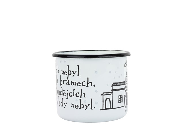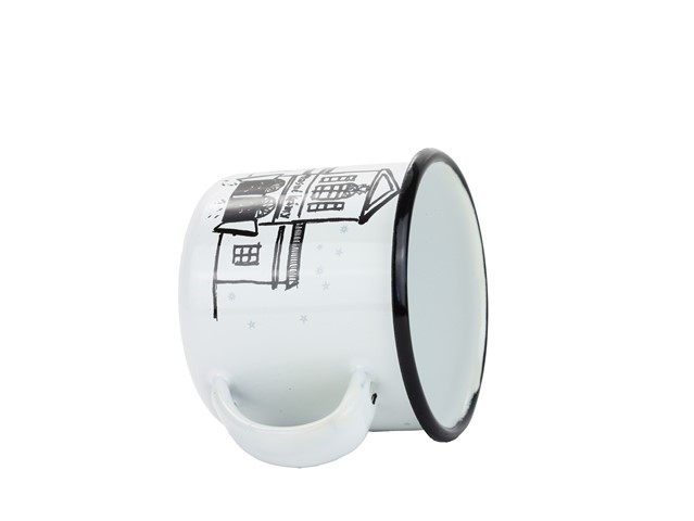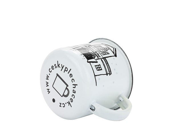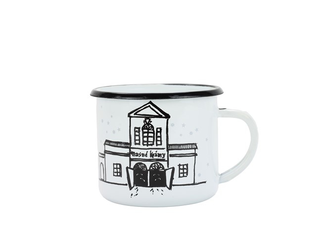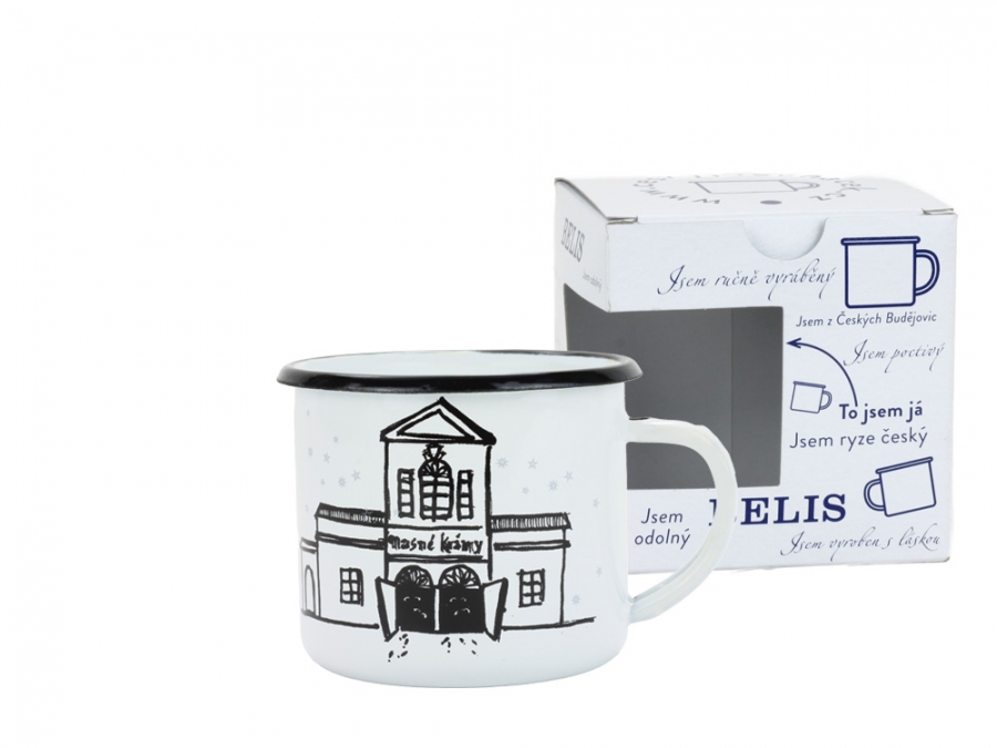 BELIS Smaltovaný hrnek ø 8 cm - 0.35 l bílý "masné krámy" v krabičce - ČESKÝ PLECHÁČEK - 11008-039PHM04