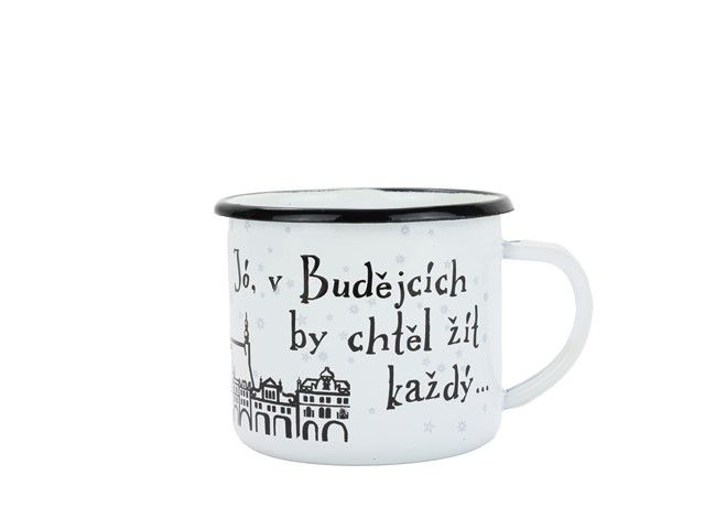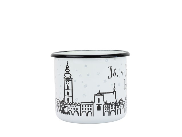 BELIS Smaltovaný hrnek ø 8 cm - 0.35 l bílý "ČB/město" v krabičce - ČESKÝ PLECHÁČEK - 11008-039PFM04