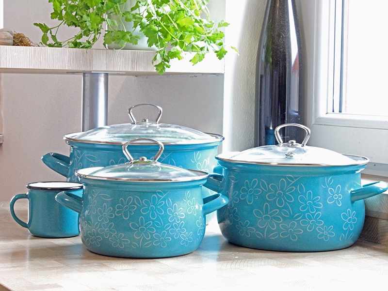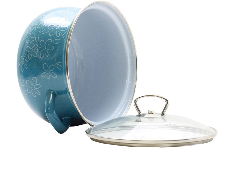 Nová řada smaltovaného nádobí FLOWER zaujme už na první pohled. A to především svým baněným tvarem a odvážným vzhledem, kterému dominuje netradiční tmavě akvamarínová barva v kombinaci s originálním reliéfovým květinovým vzorem s 3D efektem vytvářejícím dokonalou plasticitu. A právě motiv ručně kreslených květin dal i název celé řadě. Tato barevná kombinace perfektně zapadne jak do klasických a rustikálních, tak i do moderních kuchyní.3 hrnce řady FLOWER se skleněnou poklicíKvalitní nádobí musí být vyrobeno ze špičkových materiálů. Ne jinak je tomu i u řady FLOWER. Hrnce jsou vyrobeny z pevného ocelového plechu v kombinaci se speciální vrstvou smaltu. Vnitřní modro-šedý granitový smalt zaručuje maximální kvalitu, mimořádnou odolnost a naprostou zdravotní nezávadnost našeho nádobí. Součástí hrnců FLOWER je i elegantní nerezový ráfek. Celek doplňuje praktická skleněná poklice, díky které budete mít dokonalý přehled o každém připravovaném pokrmu.