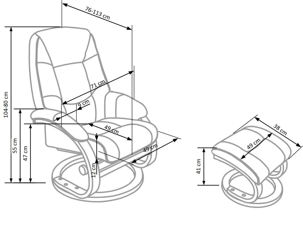 Moderní relaxační polohovací křeslo s taburetem je vyrobeno v černé kožence na dřevěné konstrukci. Křeslo má elektrickou masážní funkci s vyhříváním. Je velmi pohodlné a je vhodné jako křeslo pro odpočinek, pro čtení nebo k televizi. Zboží je dodáváno v demontovaném stavu. Rozměr křesla:celková výška: 80-104 cm celková šířka: 71 cm celková hloubka: 76-113 cm výška sedáku: 47 cm Rozměr taburetu: 49 x 47 x 41 cm